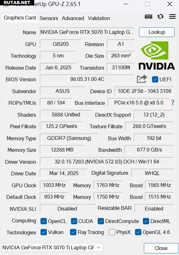 RTX 5070 Ti: 12GB GDDR7, 5888 CUDA-ядер, частота 953-1515 МГц, 192-битная шина, 672 ГБ/с пропускная способность, TDP 140W.