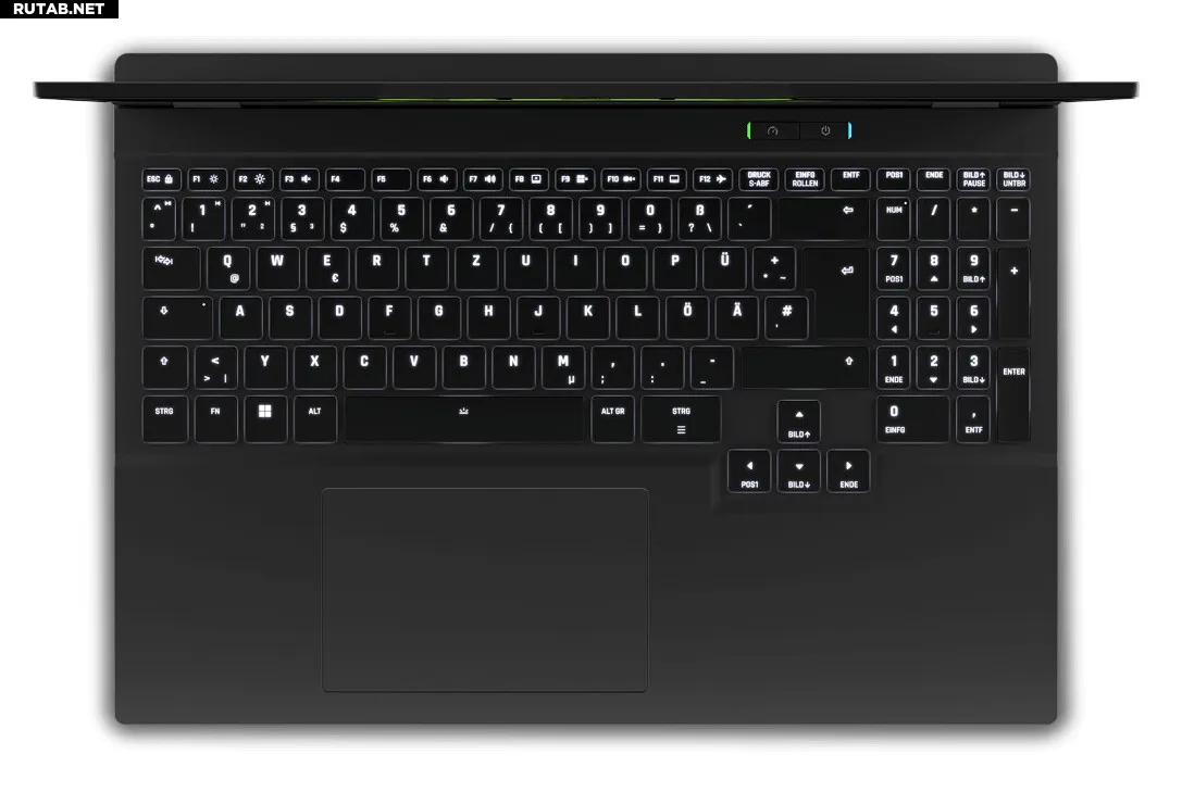 Клавиатура оснащена полноразмерным цифровым блоком, подсветкой RGB для каждой клавиши и защитой от «фантомных» нажатий. Тачпад имеет стеклоподобное покрытие и размеры 123 × 77,5 мм. Над экраном установлена веб-камера Full HD с поддержкой Windows Hello и механической шторкой конфиденциальности.