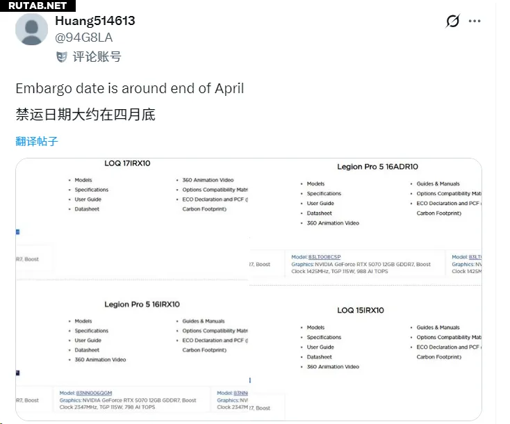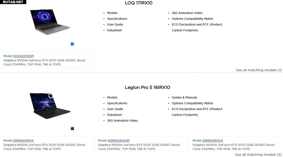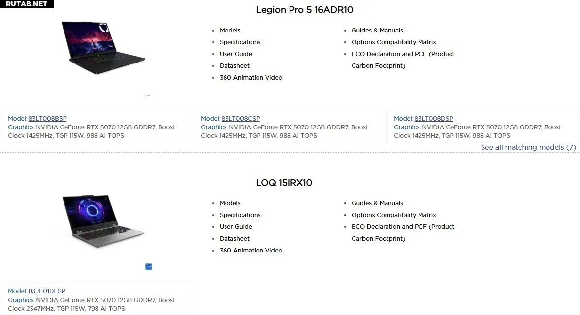 Кроме того, ресурс Videocardz обнаружил на сайте Lenovo модель Legion Pro 5 16ADR10, в спецификациях которой указана видеокарта RTX 5070 с 12 ГБ GDDR7.