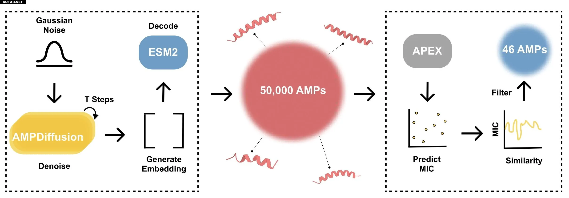 AMP-Diffusion использует ESM-2, широко используемую языковую модель белков от Meta, обученную на сотнях миллионов естественных белковых последовательностей. Это позволяет генерировать кандидатов AMP быстрее, а их выходные данные с большей вероятностью соответствуют сложным паттернам, которые делают пептиды эффективными.