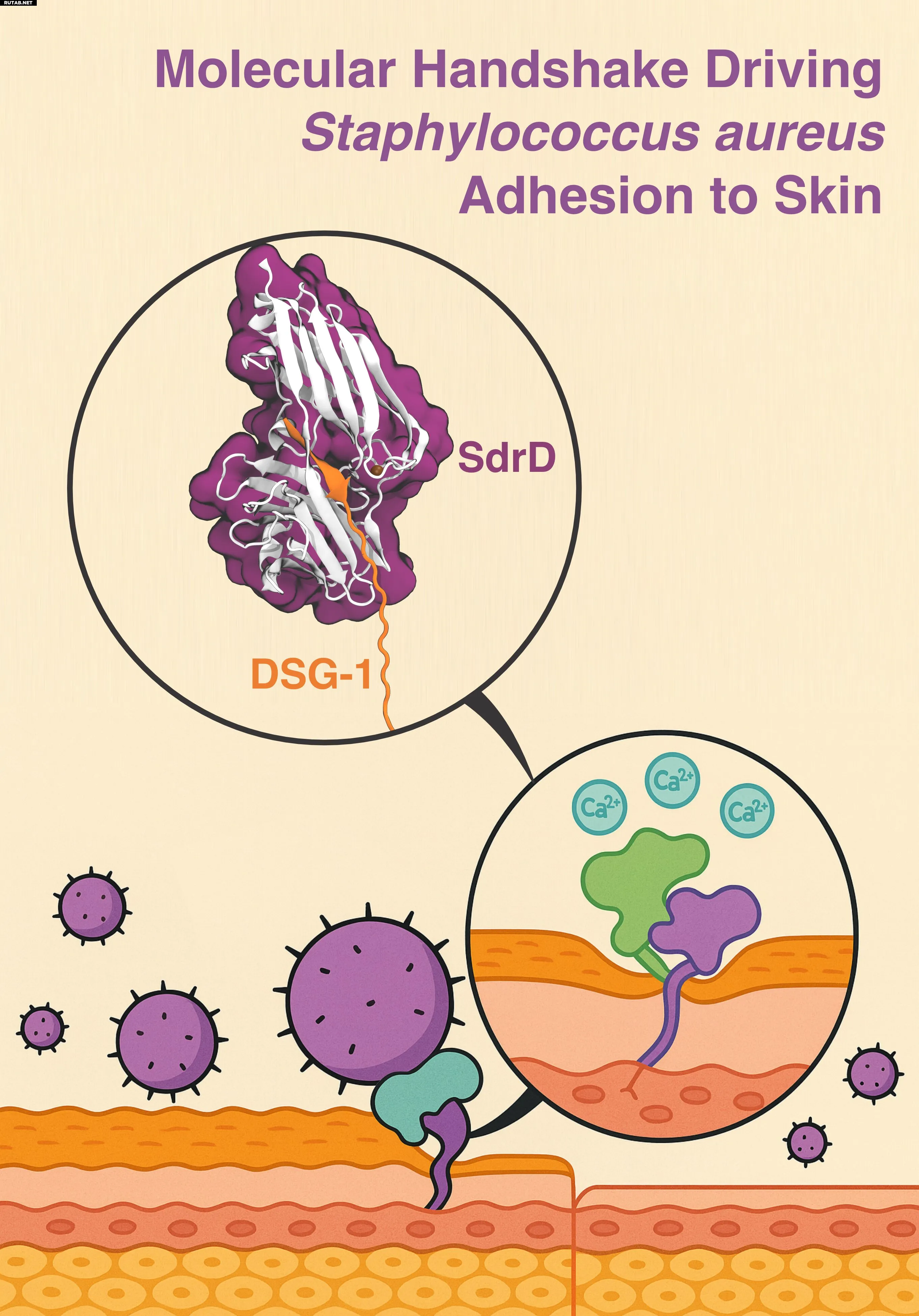 Ключевую роль в этом процессе играет бактериальный белок SdrD, который патоген использует как «кошку» для закрепления на человеческом белке десмоглеин-1. Связь между ними выдерживает экстремальные механические нагрузки, что объясняет, почему стафилококк остаётся на коже даже после мытья, трения или потоотделения.