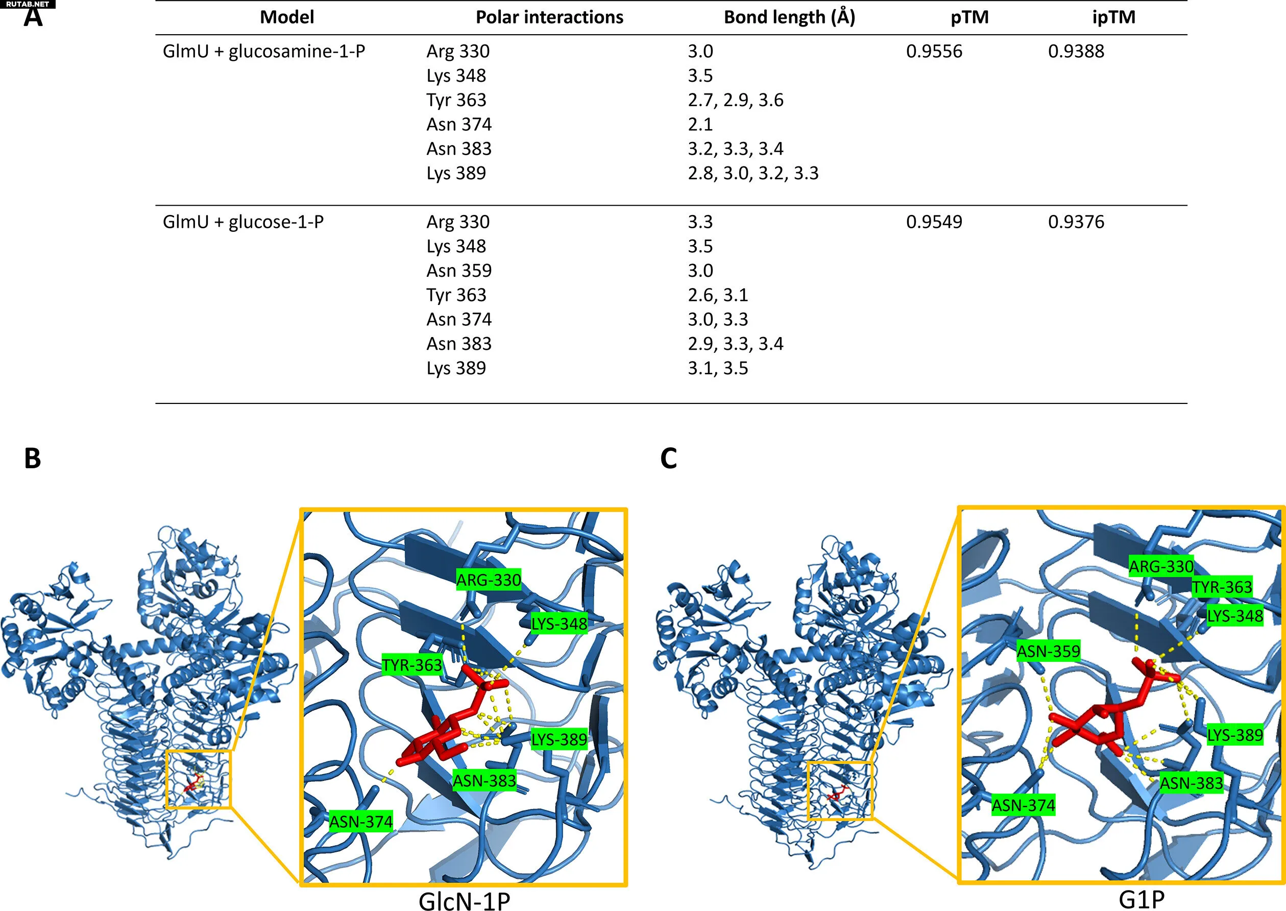 Молекулярное моделирование выявляет предполагаемый сайт связывания для ингибирования глюкозофосфата. (A) Остатки, предсказанные для взаимодействия с глюкозамин-1-Ф и глюкозо-1-Ф, предсказанное шаблонное моделирование (pTM) и интерфейсное предсказанное шаблонное моделирование (ipTM). (B) Молекулярное моделирование связывания GlmU с глюкозамин-1-Ф (красный) и связанные полярные взаимодействия. (C) Молекулярное моделирование связывания GlmU с глюкозо-1-Ф (красный) и связанные полярные взаимодействия. Автор: mBio (2025). DOI: 10.1128/mbio.01729-25