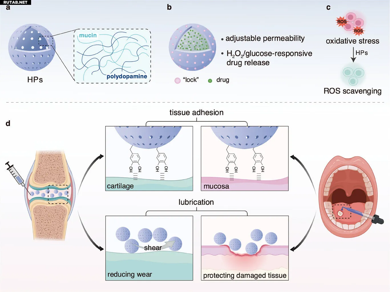 Схематическая иллюстрация свойств и функциональности полых частиц. а) Частицы производятся из смеси PDA и макромолекул муцина. b) Проницаемость частиц можно регулировать с помощью различных сшивающих агентов. c) Частицы могут поглощать свободные радикалы, защищая клетки. d) Частицы демонстрируют хорошие адгезивные свойства к тканям. Автор: Small (2025). DOI: 10.1002/smll.202503238