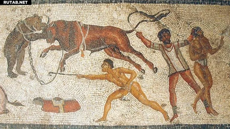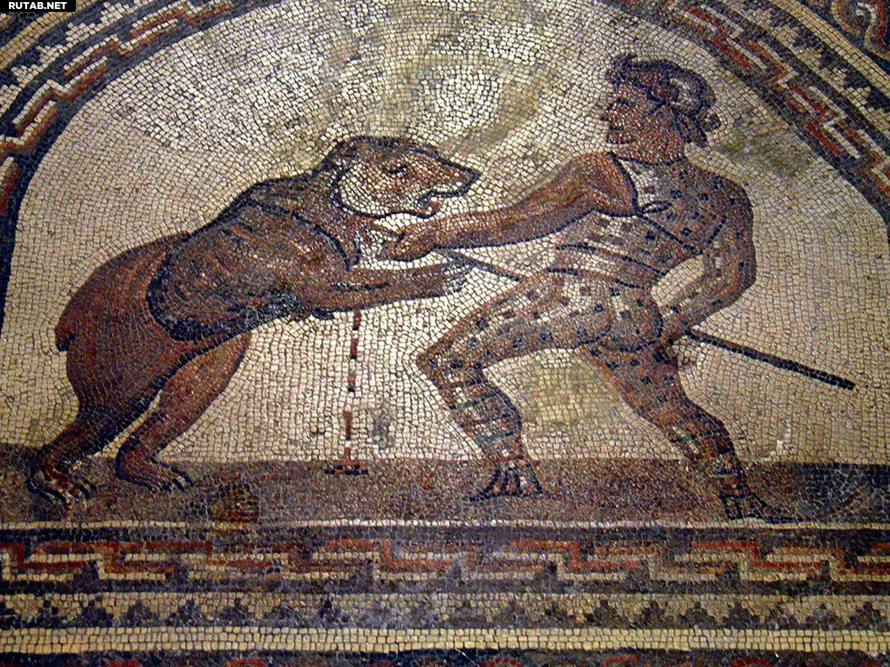 Гладиаторы сражаются с животными на этой сцене из Злитенской мозаики. Фото: Auteur inconnu