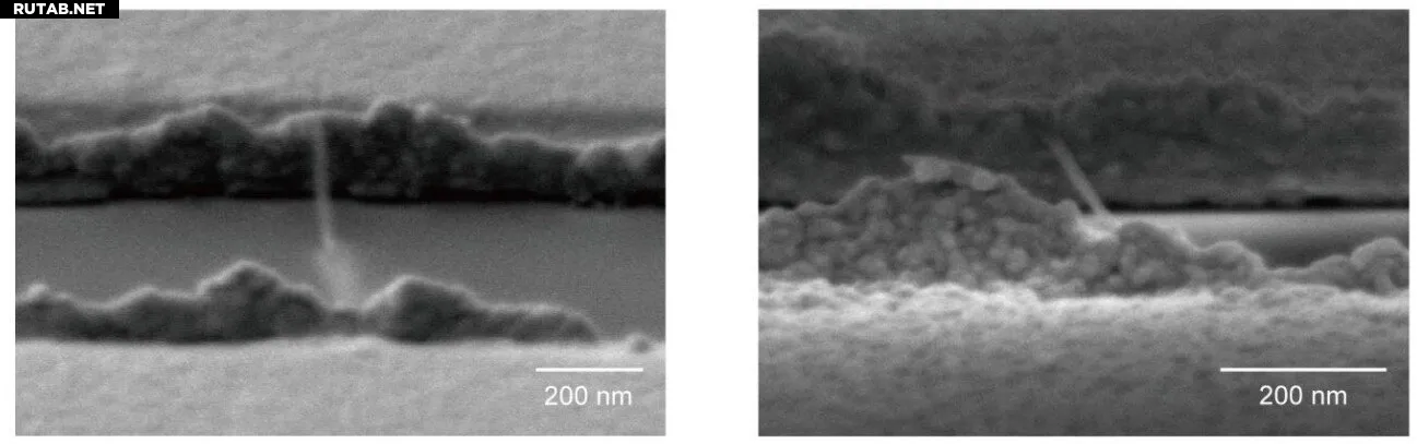 SEM-изображения сбоку, показывающие одинарный мостик из углеродных нанотрубок между электродами. Углеродная нантрубка закреплена на шероховатом крае электродов. Автор: ACS Applied Materials & Interfaces (2025). DOI: 10.1021/acsami.5c13445
