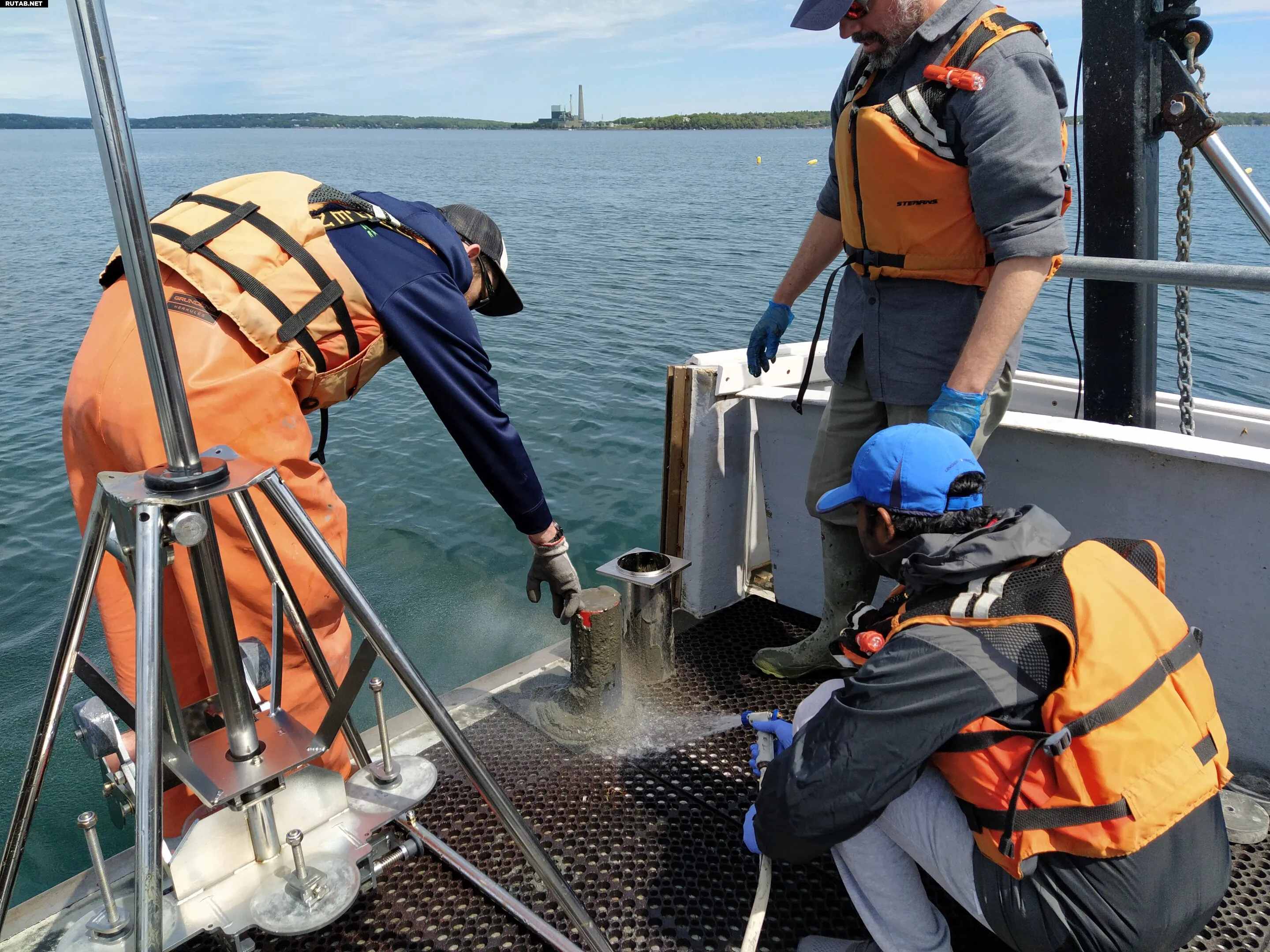 Исследовательская группа извлекает керн осадков из-под коммерческой фермы водорослей. Автор: Samuel Tan, Bigelow Laboratory