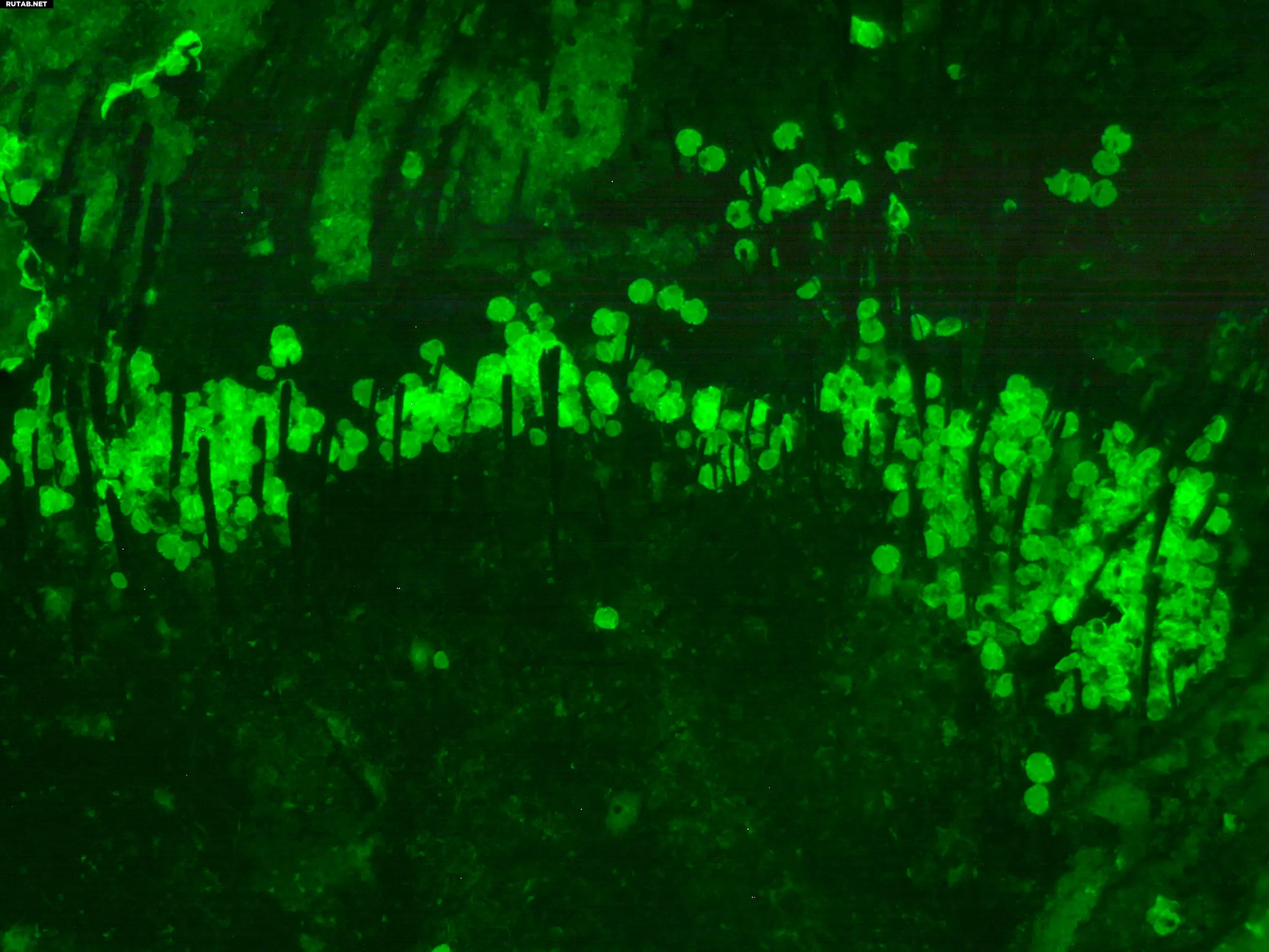 Флуоресцентная ископаемая пыльца на теле окаменелого шмеля Bombus (Kronobombus) messegus. Автор: Фридгейр Гримссон