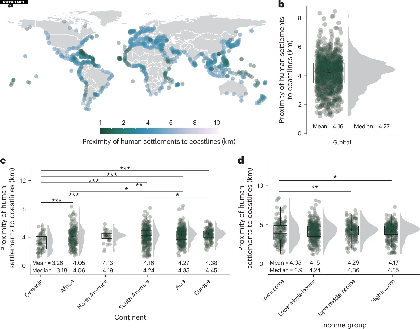 Глобальная картина близости человеческих поселений к береговым линиям. Автор: Nature Climate Change (2025). DOI: 10.1038/s41558-025-02435-6