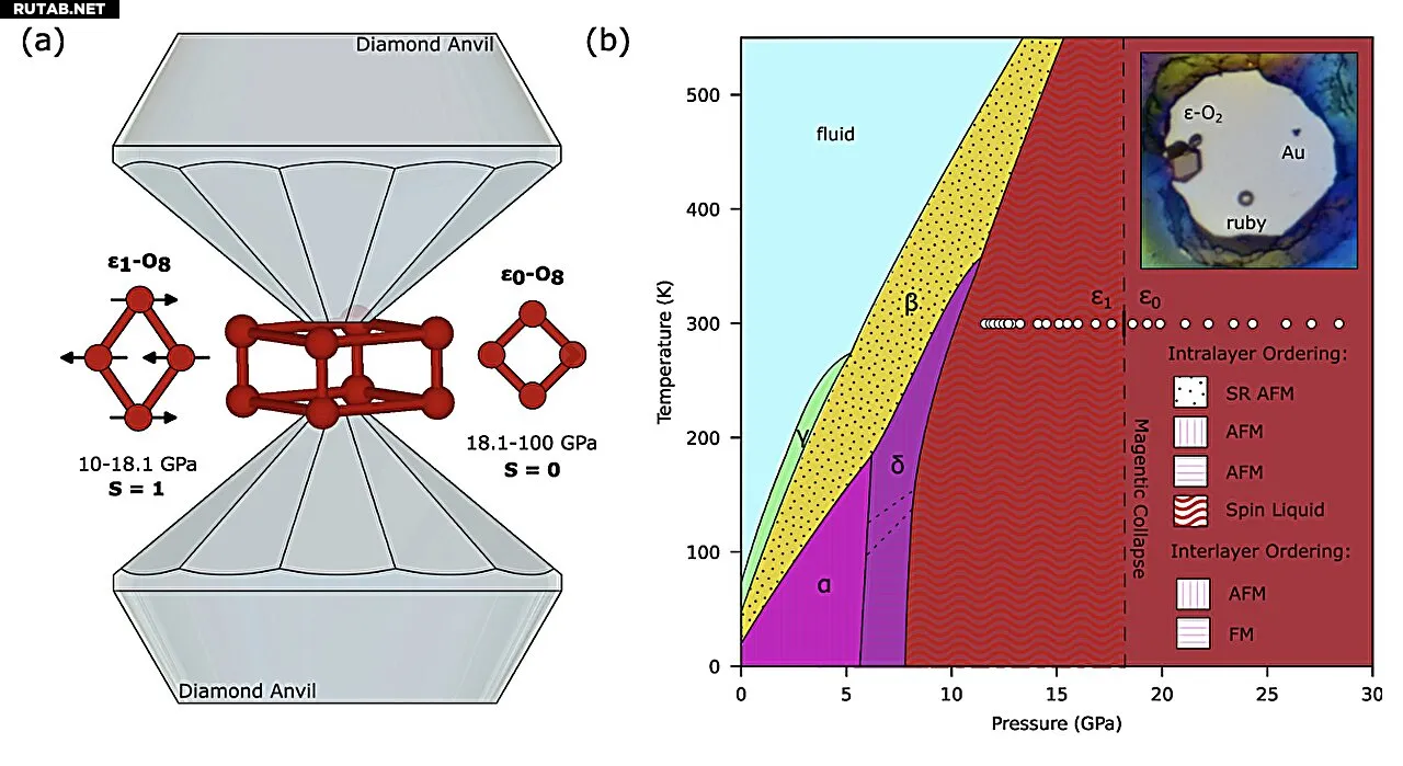 Ученые из Шанхая, Франции и Италии исследовали свойства высокотемпературной фазы твердого кислорода, известной как эпсилон-кислород (ε-O2). Используя дифракцию рентгеновских лучей на монокристалле, они обнаружили фазовый переход при давлении 18,1 ГПа, который сопровождался коллапсом молекулярного магнитного момента.
