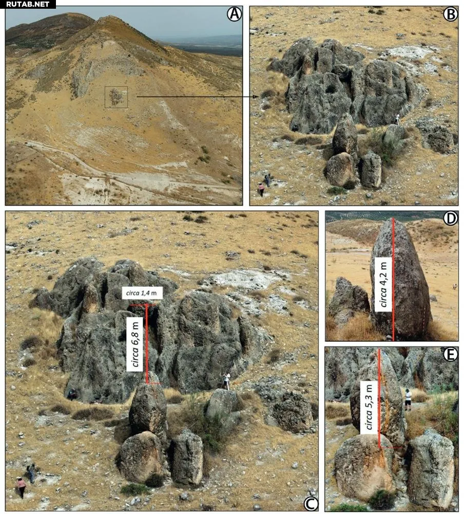 A. Вид с востока на Эль-Фонтанар с воздуха; B. Увеличенная деталь известнякового выступа и террасного памятника; C. Измерения полости в скале (женский половой орган); D–E. Измерения каменного монолита (мужской половой орган). Автор: A. Ruiz et al., Complutum (2025). CC BY 4.0