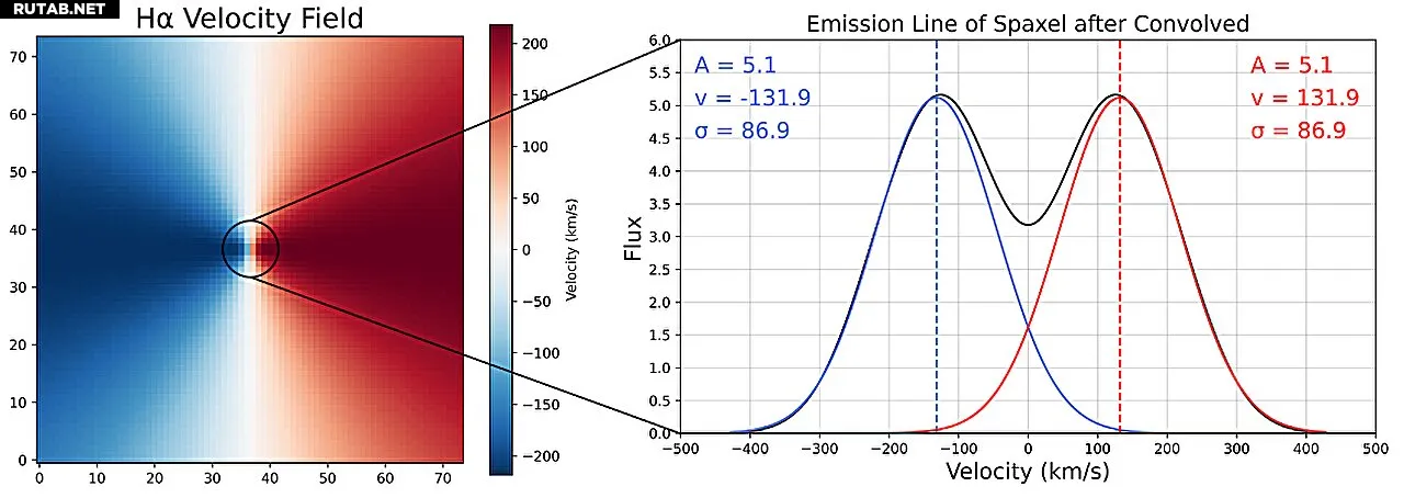Под влиянием эффекта PSF в области крутых изменений центральной кривой вращения спиральной галактики с перемычкой генерируется двойной профиль. Автор: SHAO
