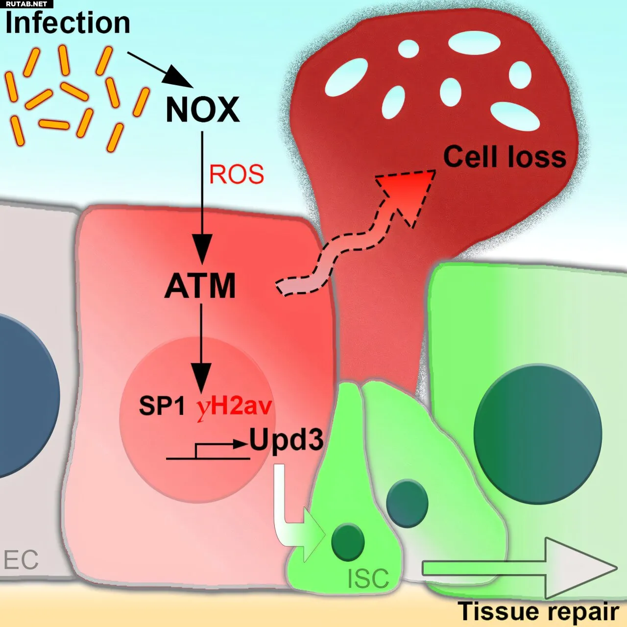 Исследователи показали, что путь ATM-gH2av, активируемый патогенами, участвует в двух процессах. Во-первых, он участвует в устранении части повреждённых клеток. А во-вторых, помогает сигнализировать и побуждать стволовые клетки заменять эти повреждённые клетки.