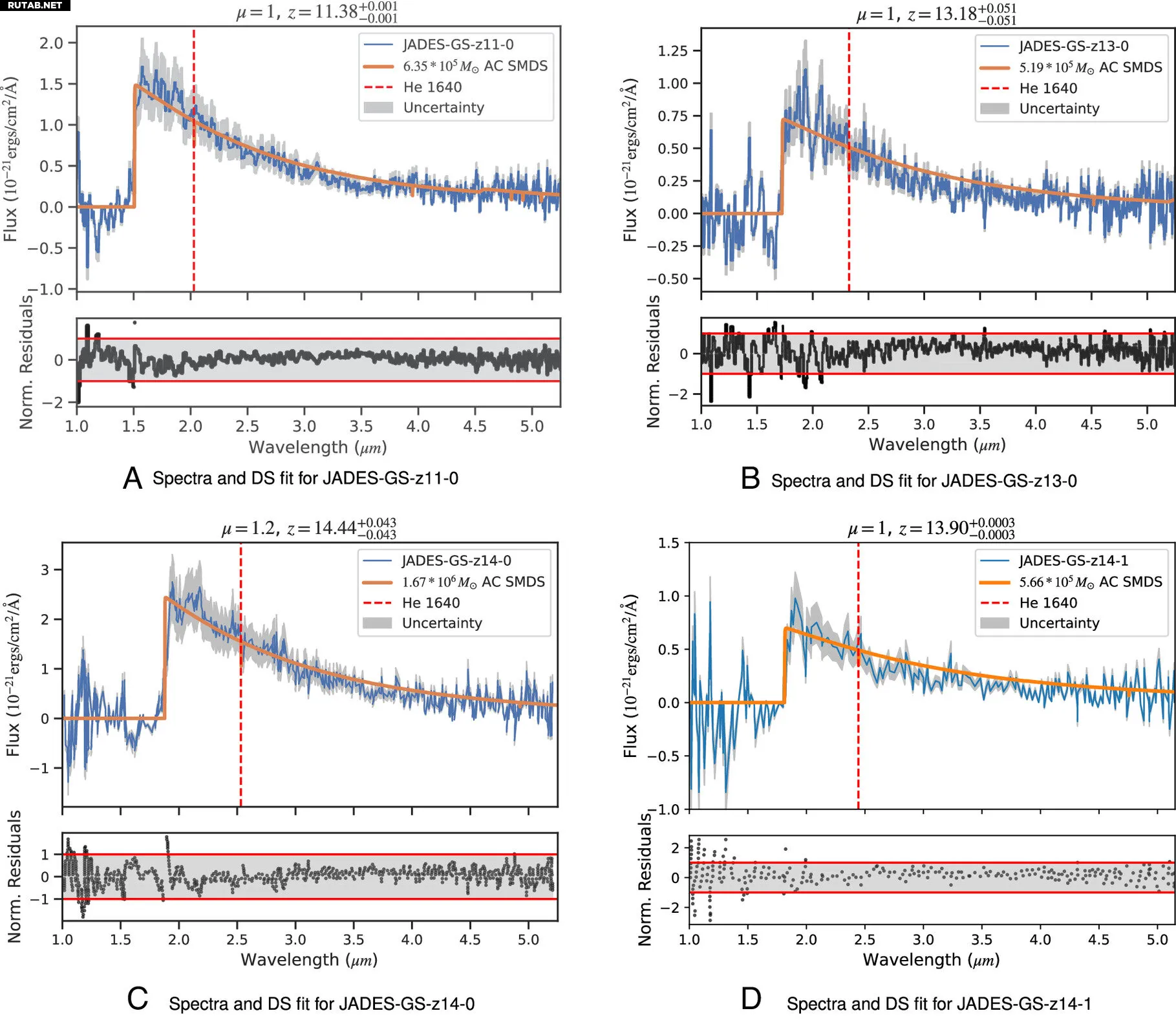 (A-D) Первые четыре спектральных кандидата в сверхмассивные тёмные звёзды. Автор: Proceedings of the National Academy of Sciences (2025)