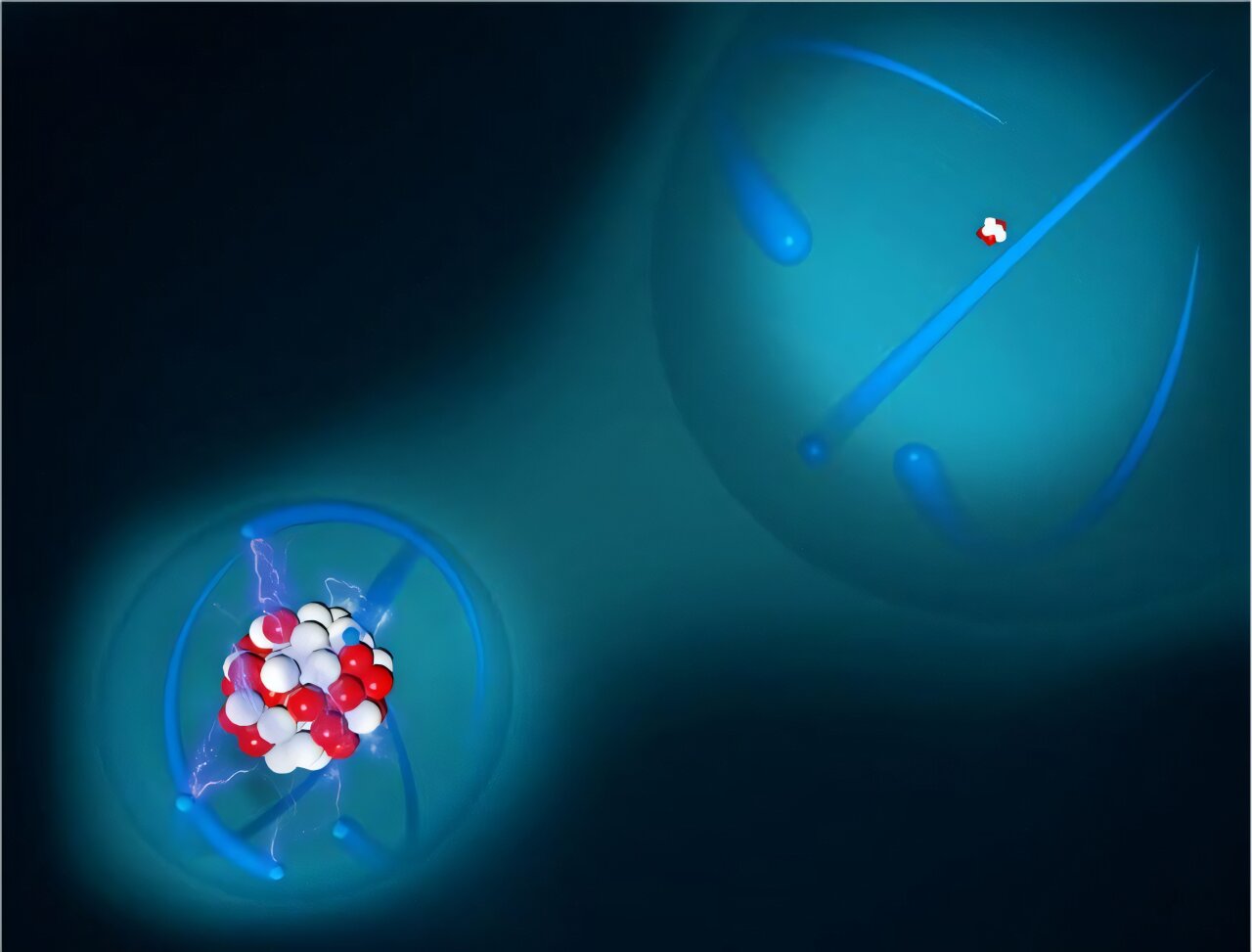 Художественное изображение высокозаряженного иона (слева), захваченного вместе с бериллиевым логическим ионом (справа) для симпатического охлаждения и квантового логического считывания. Автор: PTB