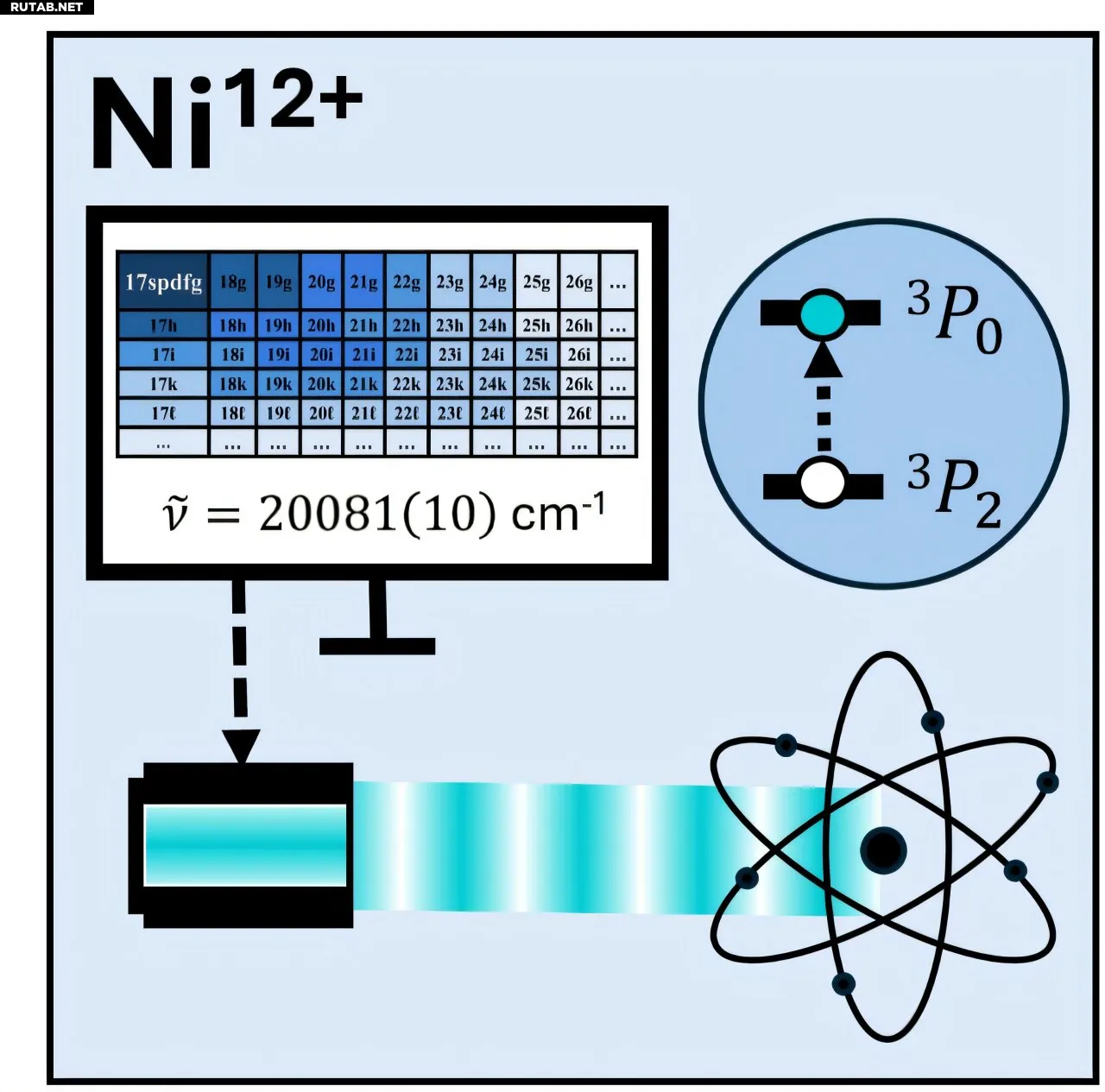 Схема компонентов эксперимента. Точные расчёты позволяют оценить частоту перехода с беспрецедентной точностью. Это используется для настройки лазера на резонанс и приводит к успешному возбуждению Ni¹²⁺. Автор: PTB