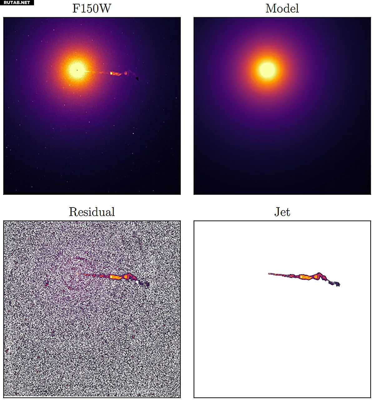 Обработка изображения F150W: полное изображение F150W, сглаженная модель галактики, остаточное и замаскированное изображение джета. Автор: Astronomy & Astrophysics (2025). DOI: 10.1051/0004-6361/202556577