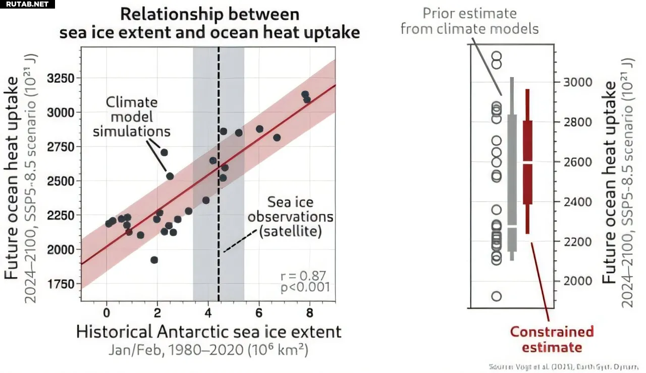 Слева: обнаружена сильная связь между исторической площадью антарктического морского льда и будущим поглощением тепла мировым океаном в климатических моделях. Справа: сочетание этой связи со спутниковыми наблюдениями за морским льдом приводит к увеличению оценок будущего поглощения тепла океаном до 14%. Автор: Earth System Dynamics (2025). DOI: 10.21203/rs.3.rs-3982037/v2