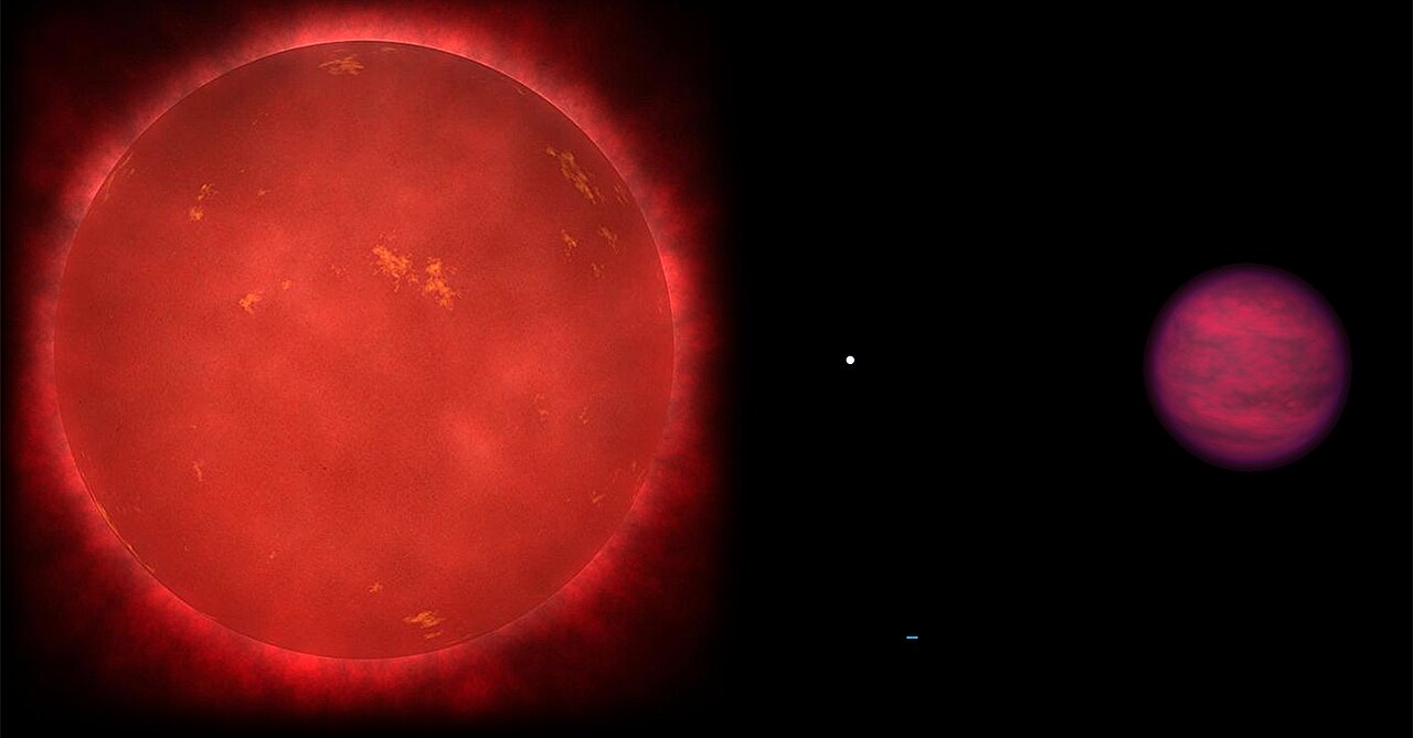 Схема тройной системы Wolf 1130ABC, состоящей из красного карлика Wolf 1130A (слева), его близкого и компактного компаньона белого карлика Wolf 1130B (в центре) и далёкого третичного коричневого карлика Wolf 1130C (справа). Три компонента этой системы показаны в масштабе их относительных размеров. Автор: Адам Бургассер