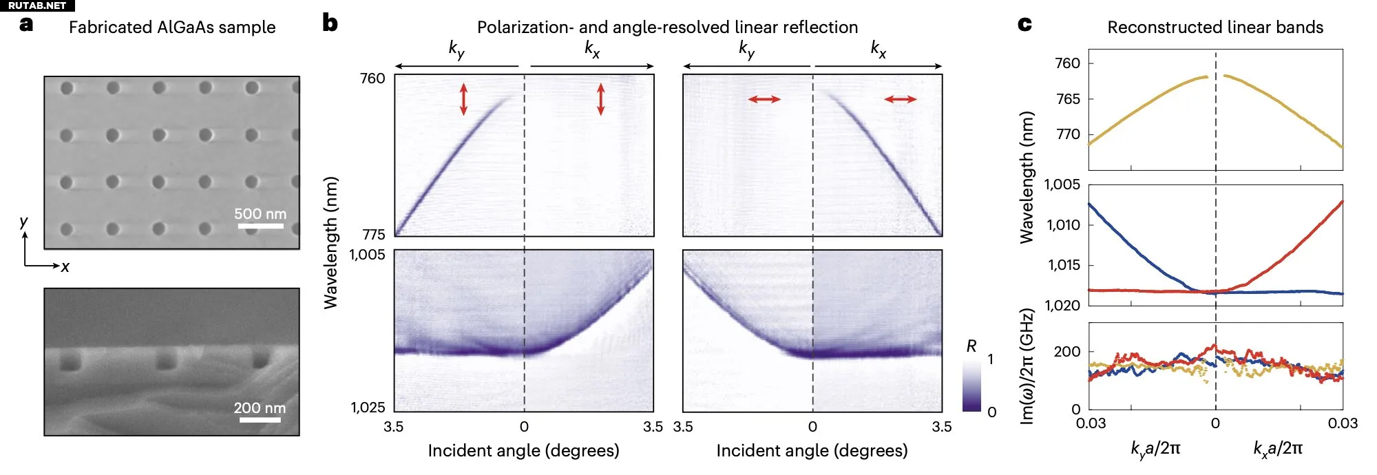 Линейная характеристика фотонных кристаллов AlGaAs. a — изображения кристалла, полученные с помощью сканирующего электронного микроскопа. b — угловые измерения линейного отражения. c — резонансные частоты и скорости затухания трёх фотонных зон. Автор: Jin et al. (Nature Nanotechnology, 2025).