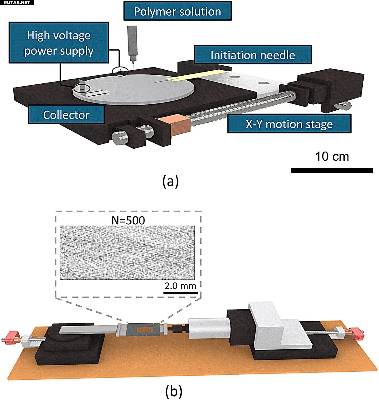Схемы (a) аппарата для ближнепольного электроспиннинга и (b) устройства для механических испытаний. Автор: Soft Matter (2025). DOI: 10.1039/d4sm01288g