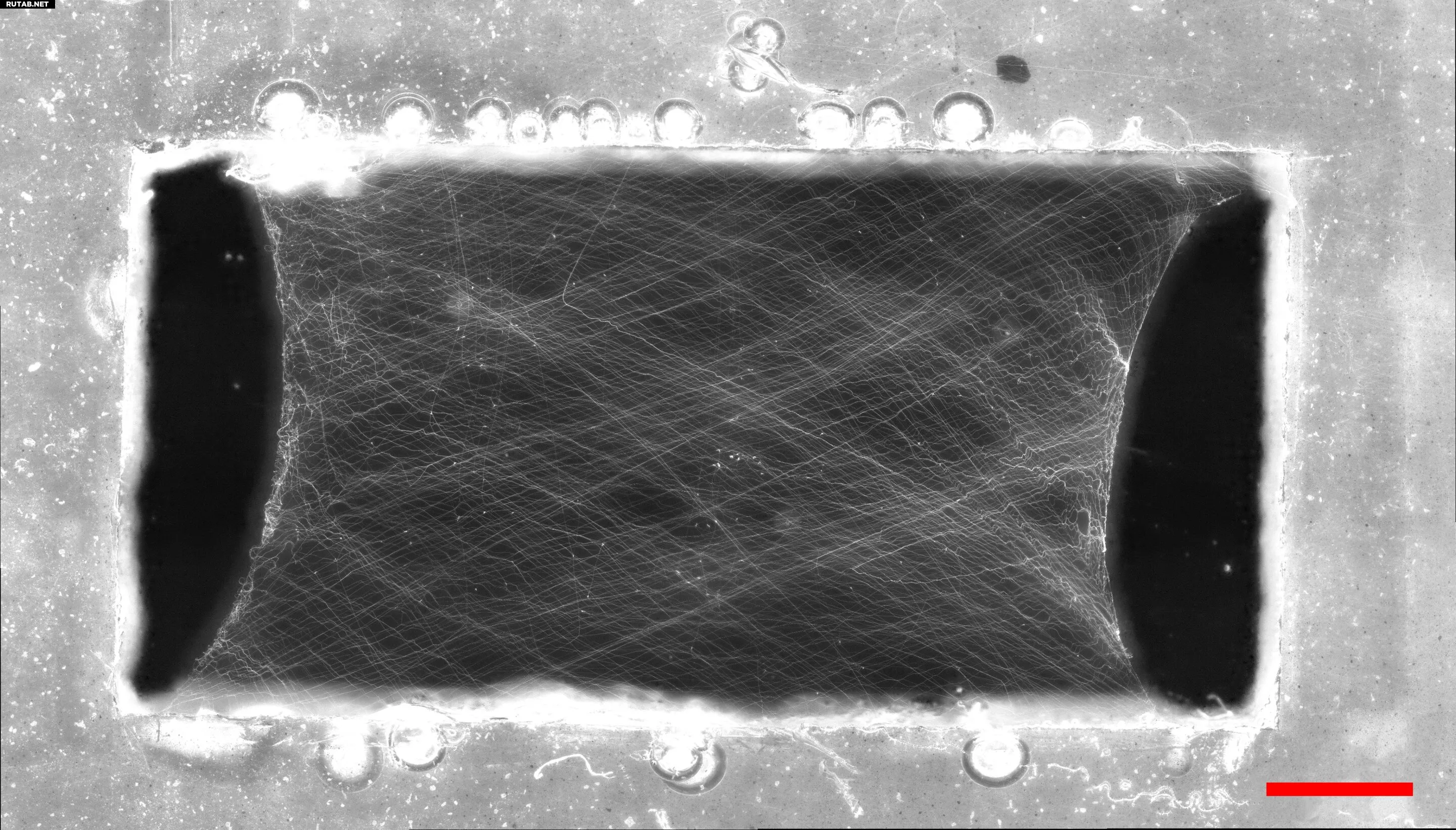 Напечатанная сеть полиэтиленоксидных нановолокон с 5000 волокон. Масштабная линейка — 1 мм. Автор: University of Illinois at Urbana-Champaign