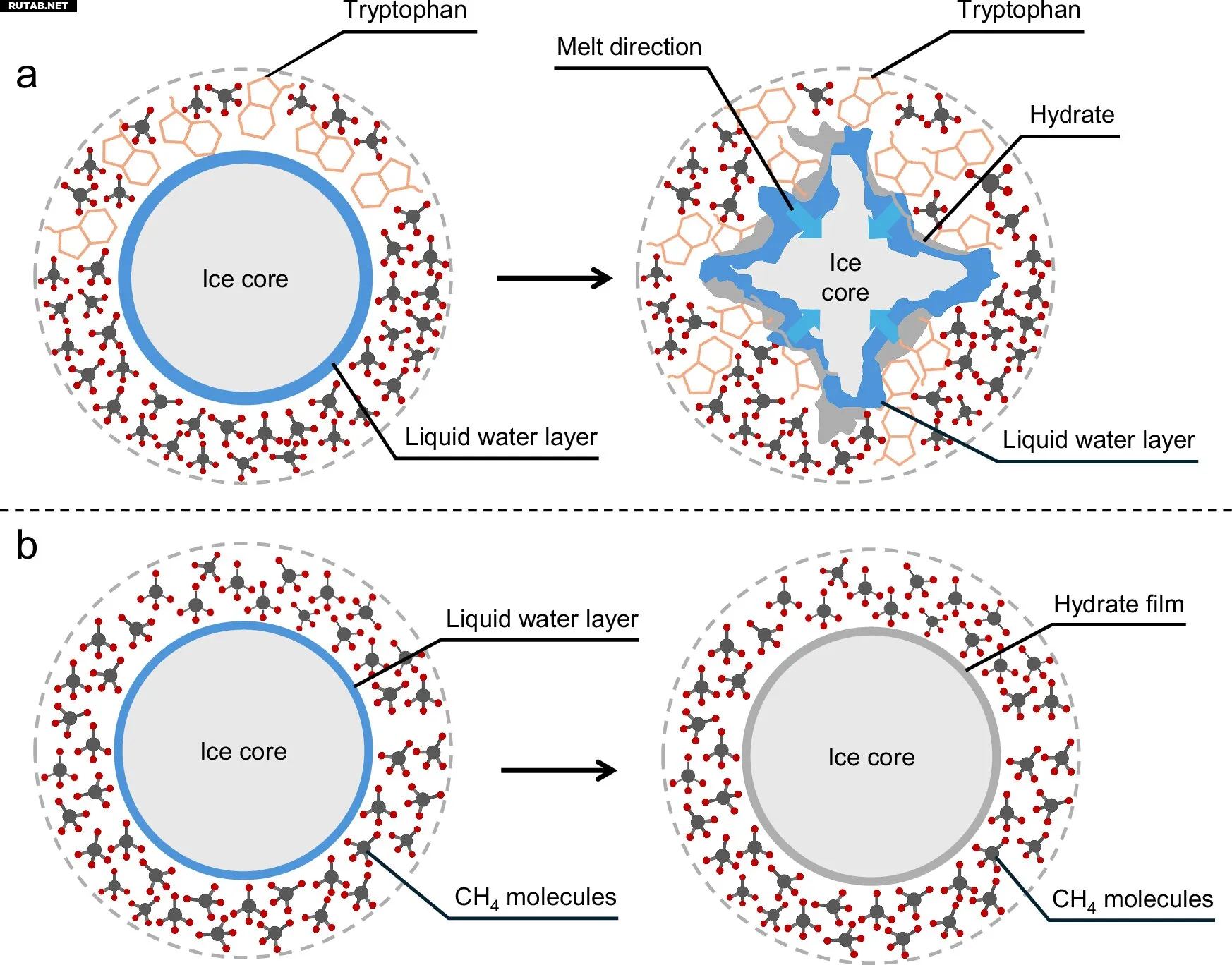 Исследователи также установили, что лучше всего работают гидрофобные аминокислоты, такие как триптофан, метионин и лейцин, которые создают на поверхности льда микрослои жидкости, способствующие росту гидратных кристаллов.