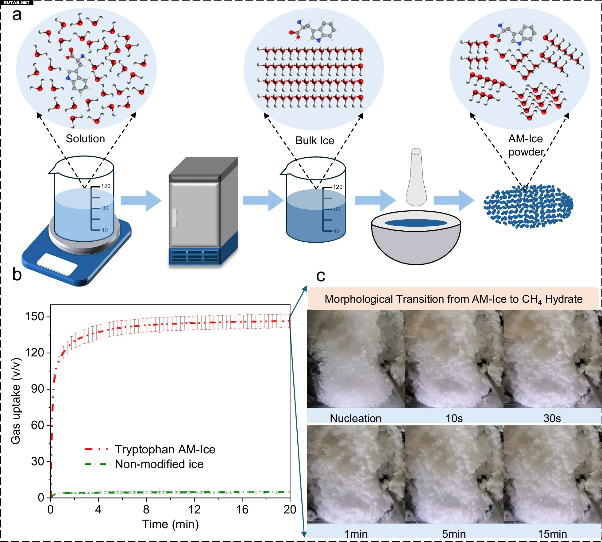 Команда под руководством профессора Правина Линги обнаружила, что добавление небольшого количества аминокислот в воду перед заморозкой создает пористую ледяную структуру, которая быстро поглощает метан. В испытаниях материал достиг 90% своей емкости хранения всего за 2 минуты.