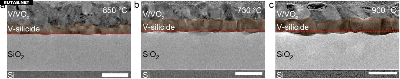 Нестабильность интерфейса в группе B. Поперечные ТЭМ-изображения образцов ванадиевого силицида на подложках SOI со скрытым SiO₂, отожженных при (a) 650 °C, (b) 730 °C и (c) 900 °C. Автор: Applied Physics Letters (2025). DOI: 10.1063/5.0291576