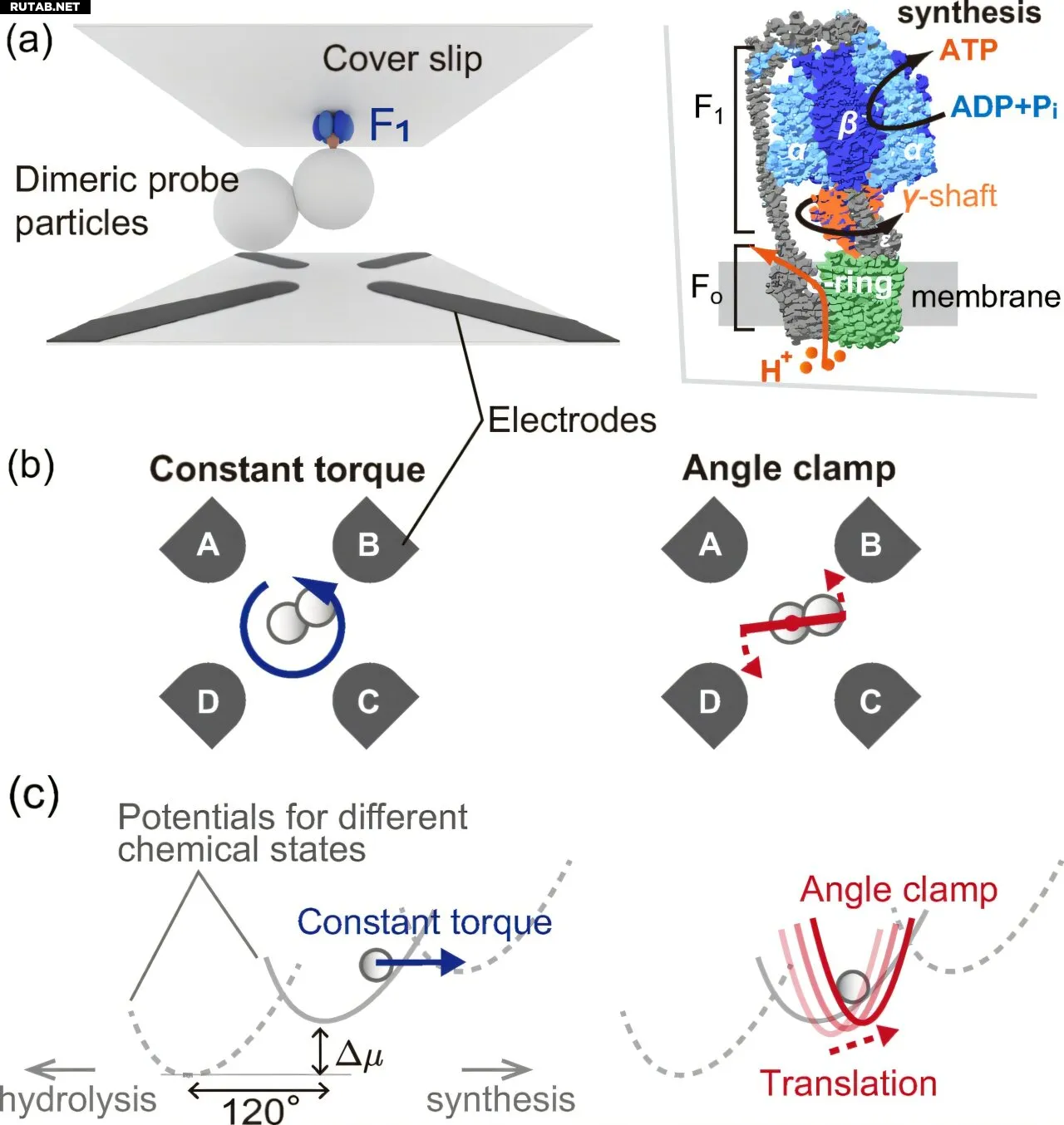 Контроль отдельной молекулы F1 как модельной системы АТФ-синтазы. (a) Исследователи внешне вращали F1, полученную из термофильной Bacillus PS3 [6], прикладывая крутящий момент к зонду, прикрепленному к её γ-валу. Вращение наблюдали с помощью видеомикроскопии на частоте 4 кГц. Врезка: FoF1-АТФ-синтаза. (b) Реализация режимов постоянного крутящего момента и фиксации угла путем варьирования амплитуд и фаз переменного напряжения на четырех электродах (A–D) [7]. (c) Профиль свободной энергии возникает из взаимодействия между γ-валом и статором F1 и изменения химической свободной энергии Δμ гидролиза АТФ. Зонд, прикрепленный к γ-валу, вращали в направлении синтеза АТФ с постоянным крутящим моментом (слева) или с удерживающим моментом, при котором центр ловушки вращался с постоянной скоростью (справа). Автор: Physical Review Letters (2025). DOI: 10.1103/b24h-v7by