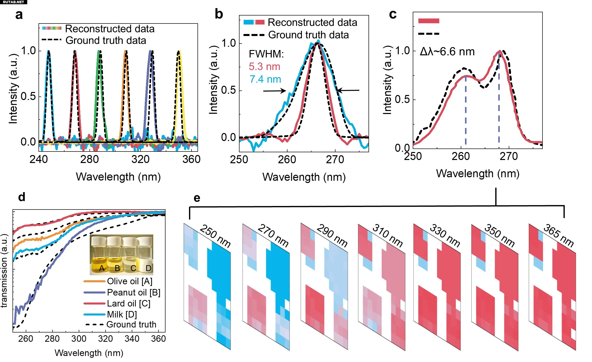 С помощью этого чипа исследователи успешно выполнили пространственно разрешенное одновременное изображение капель органических жидкостей. Каждый пиксель записывал зависящие от длины волны сигналы фототока, генерируя полный трехмерный набор данных. После спектрального восстановления через нейронные сети были получены спектральные изображения высокого разрешения, четко показывающие различные УФ-характеристики поглощения и пространственное распределение органических веществ.
