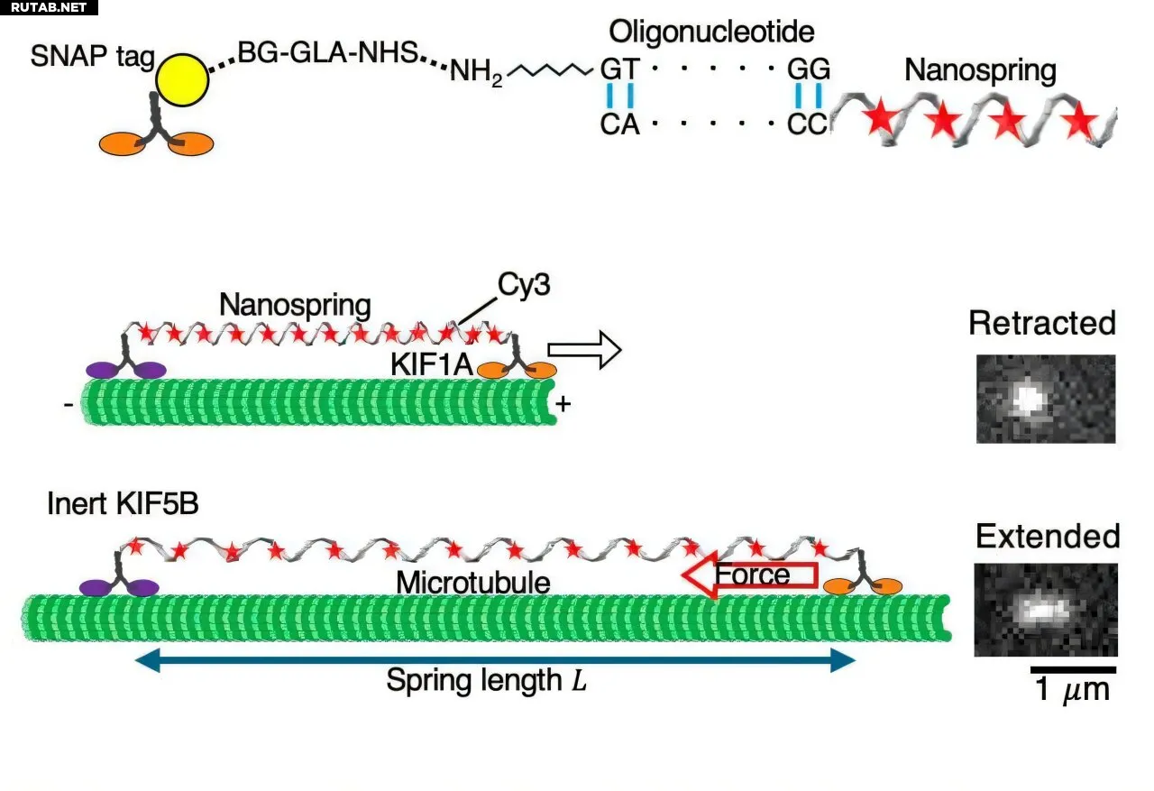Нанопружина длиной в несколько нанометров создается методом ДНК-оригами, когда длинная нить ДНК складывается с помощью более коротких нитей. Прикрепленная к неподвижной поверхности и белку KIF1A, она растягивается в зависимости от приложенной силы, а флуоресцентное свечение позволяет точно измерить степень растяжения под микроскопом.