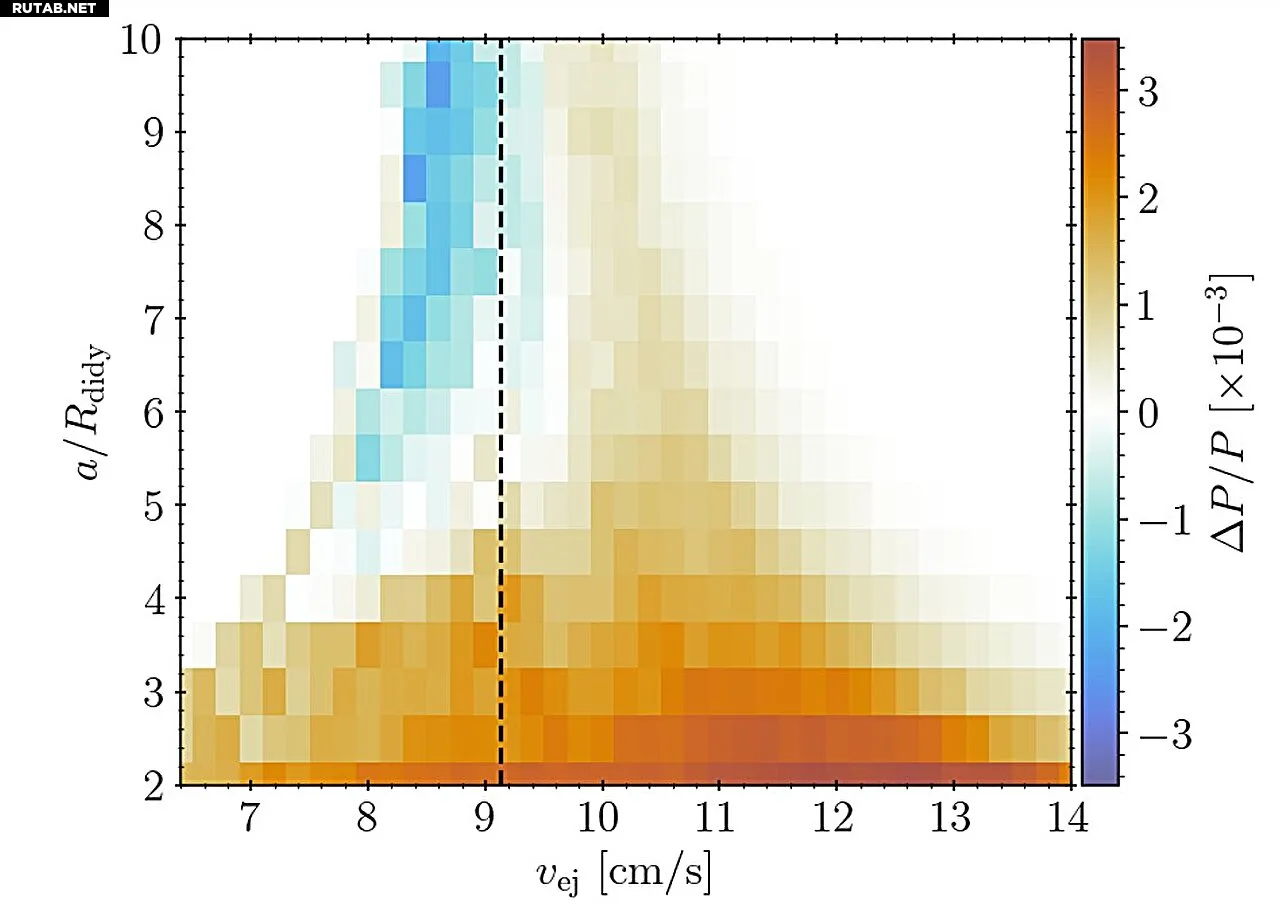 Доля изменения орбитального периода двойной системы в зависимости от скорости выброса и большой полуоси Диморфоса. Автор: arXiv (2025). DOI: 10.48550/arxiv.2509.20197