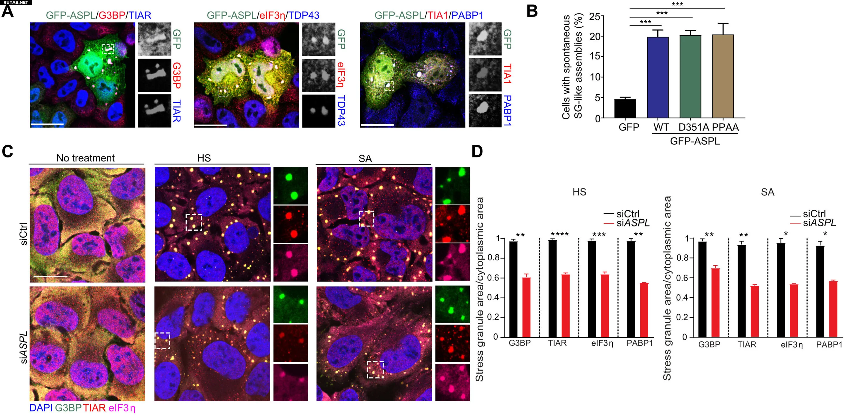 Исследование, опубликованное в Science Advances, показало, что ASPL регулирует разрушение стрессовых гранул, способствуя фосфорилированию белка VCP. Одновременно ASPL облегчает сборку стрессовых гранул независимо от VCP, стабилизируя взаимодействия между основными белками гранул.