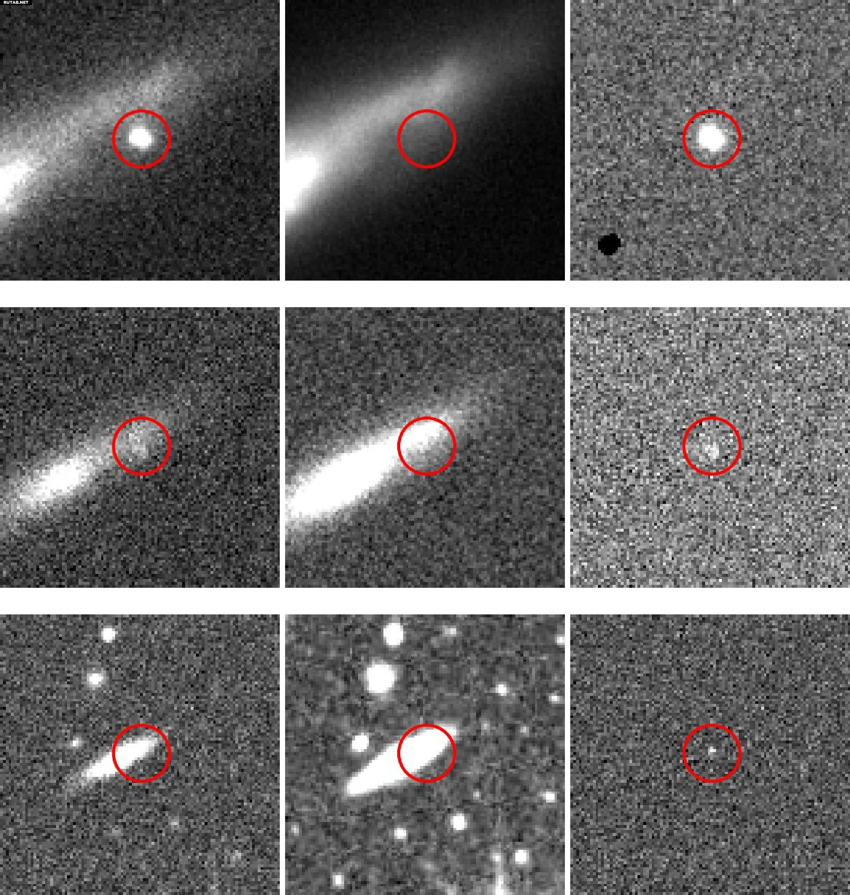Один и тот же транзиент показан в трёх обзорах: Pan-STARRS (сверху), MeerLICHT (посередине) и ATLAS (снизу). Красные круги отмечают ожидаемое положение кандидата. Автор: Nature Astronomy (2025)