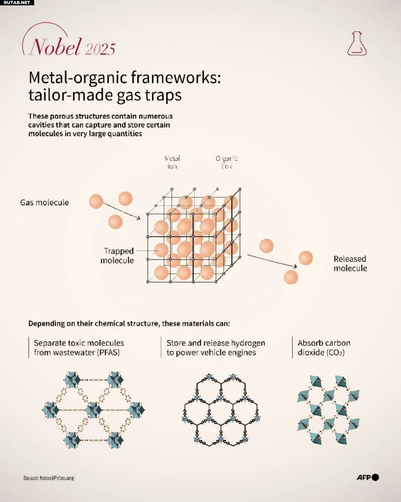 Нобелевская премия по химии 2025 года присуждена трем ученым — Сусуму Китагаве (Япония), Ричарду Робсону (Великобритания) и Омару Яги (США/Иордания) за открытие металло-органических каркасов (МОК) — пористых материалов, способных поглощать и удерживать молекулы газов и жидкостей.