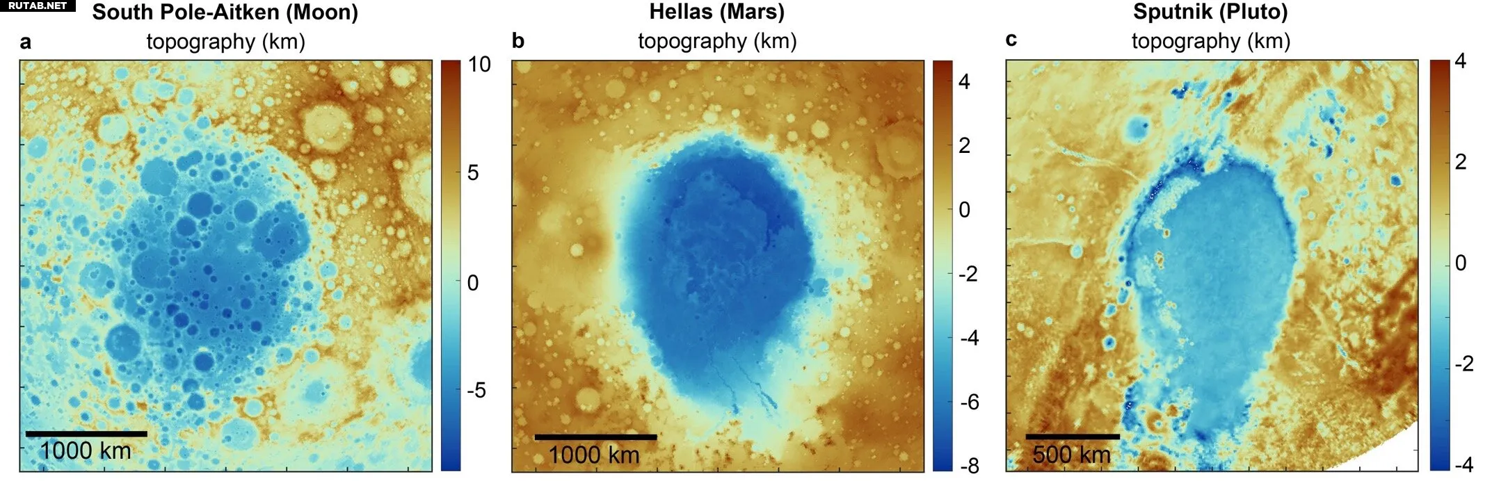 Ударные кратеры на разных телах Солнечной системы имеют схожую форму. Бассейн Южный полюс — Эйткен на Луне (слева), бассейн Эллада на Марсе (в центре) и бассейн Спутник на Плутоне (справа) образовались в результате косых ударов. Их очертания сужаются в направлении удара. Автор: Джефф Эндрюс-Ханна/Университет Аризоны/NASA