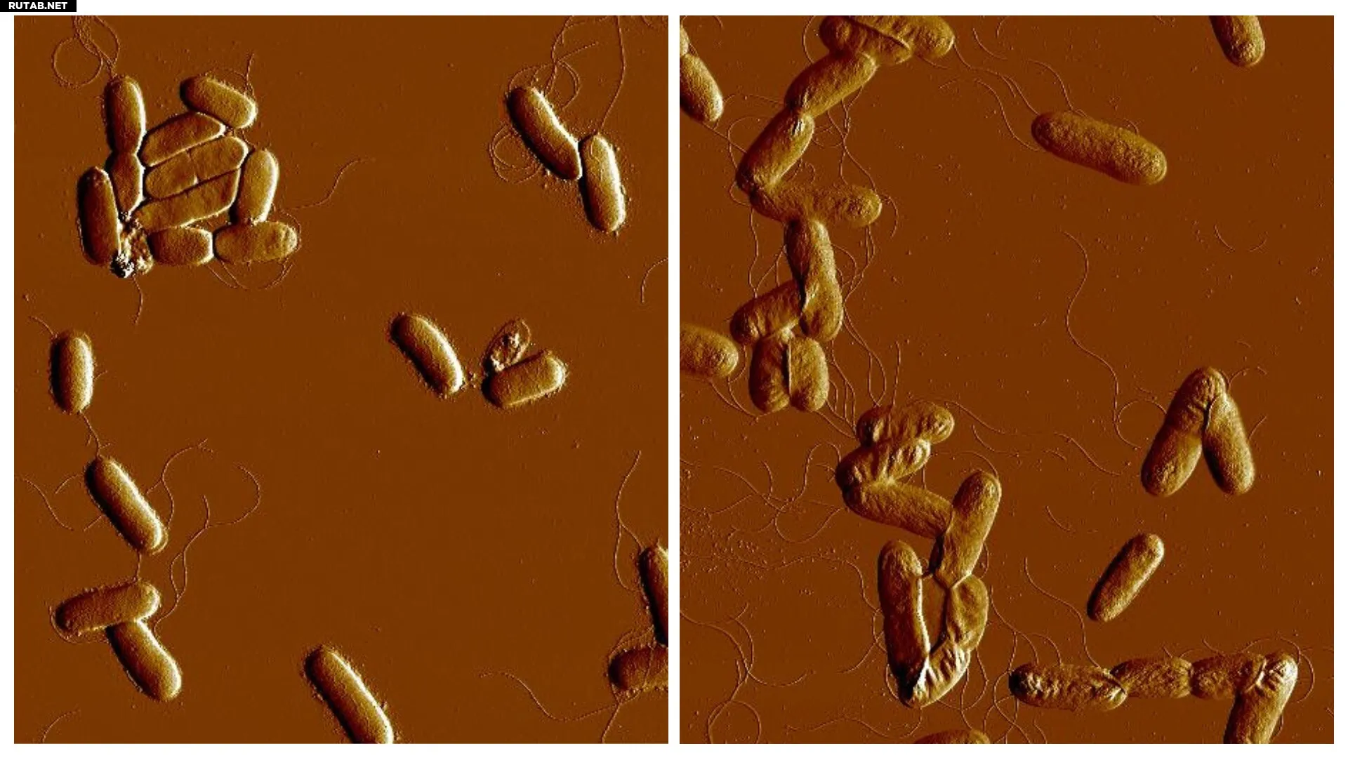 Снимки атомно-силовой микроскопии клеток Yersinia pseudotuberculosis, лишённых белка RfaH, в условиях высокой солёности. Отсутствие RfaH приводит к дефектам поверхности бактерий, заставляя их слипаться в стрессовой среде. Автор: Кемаль Авиджан