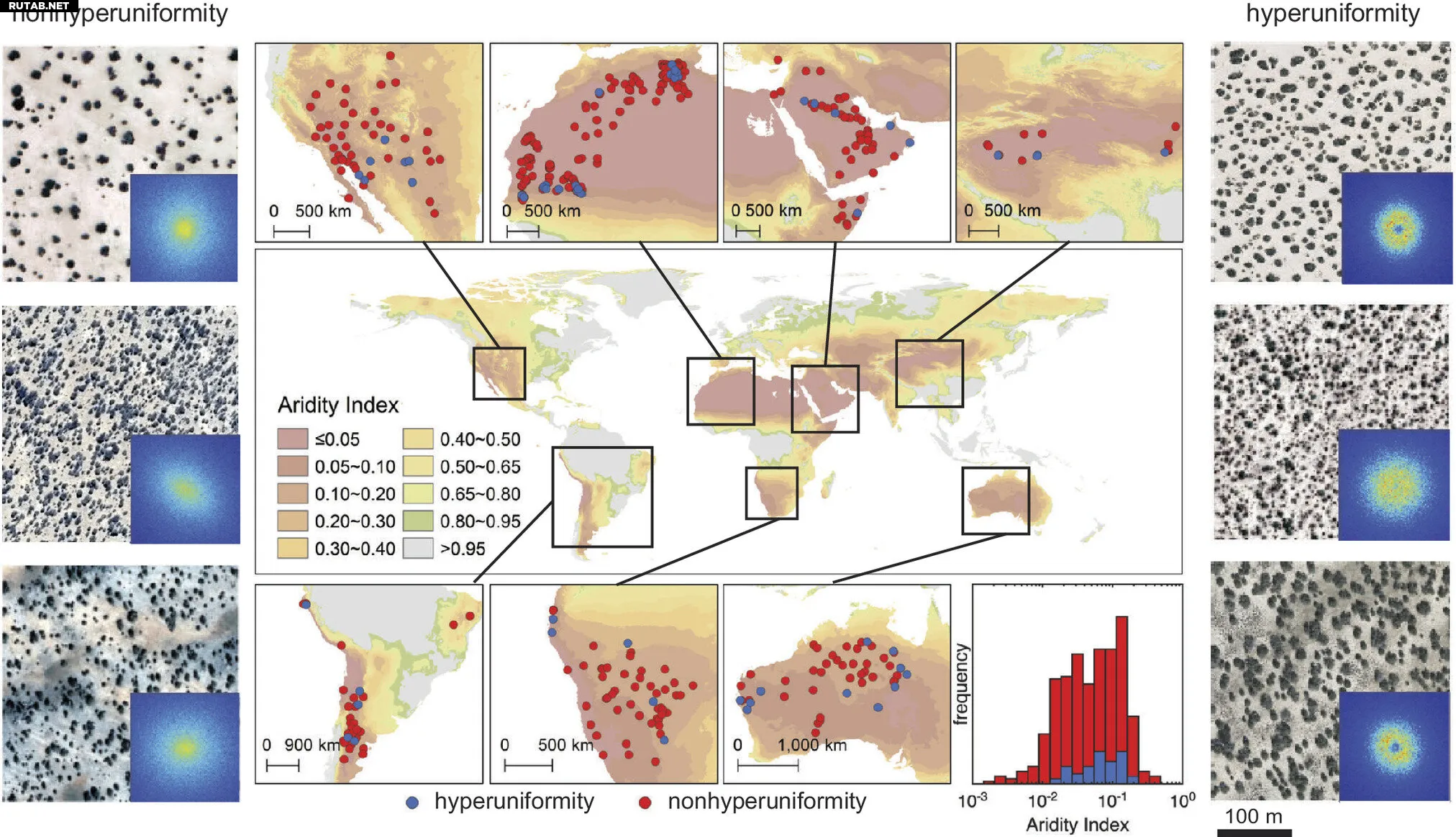 Анализ спутниковых снимков более 400 засушливых регионов показал, что примерно каждый десятый из них демонстрирует признаки неупорядоченной гипероднородности. Это делает данное явление глобальной особенностью засушливых экосистем, а не редкой аномалией.