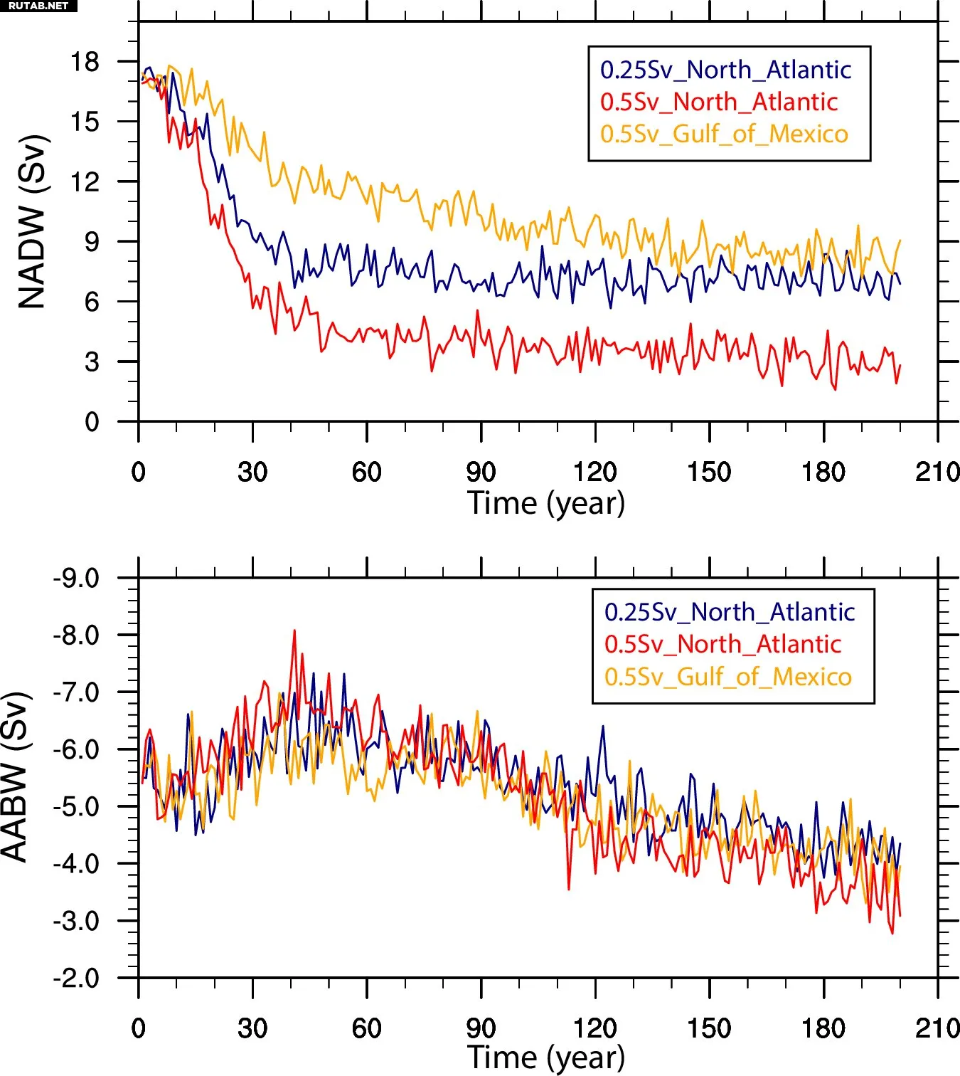 Согласно модели исследователей, два образования придонных вод — Североатлантическое и Антарктическое — ослабли одновременно, как два массивных хранилища, внезапно переставшие принимать CO₂.