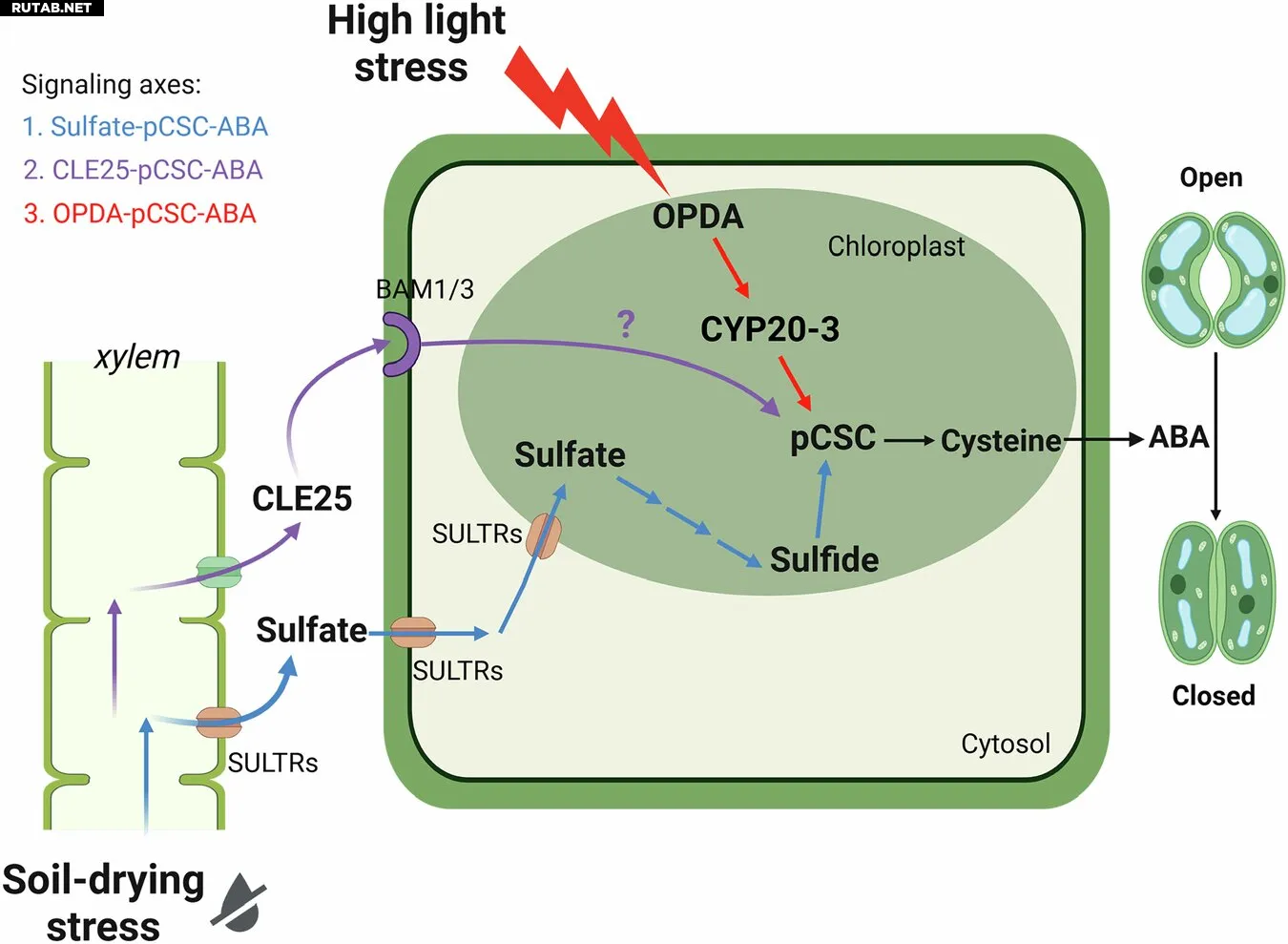 Для активации замыкающих клеток цистеинсинтазный комплекс в хлоропластах, состоящий из двух ферментов, оценивает ряд сигналов. Среди них — сигнал о питательном сульфате и небольшая белковая молекула, которые транспортируются из корней в побеги при пересыхании почвы.