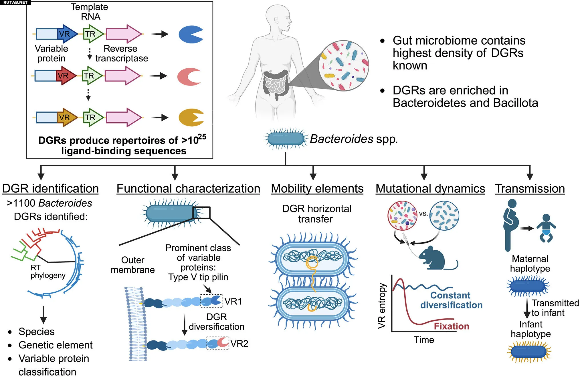 Исследование, опубликованное в журнале Science, показало, что DGRs создают случайные мутации в определённых участках бактериальных геномов. Около четверти этих элементов нацелены на гены, ответственные за закрепление бактерий в новых условиях.