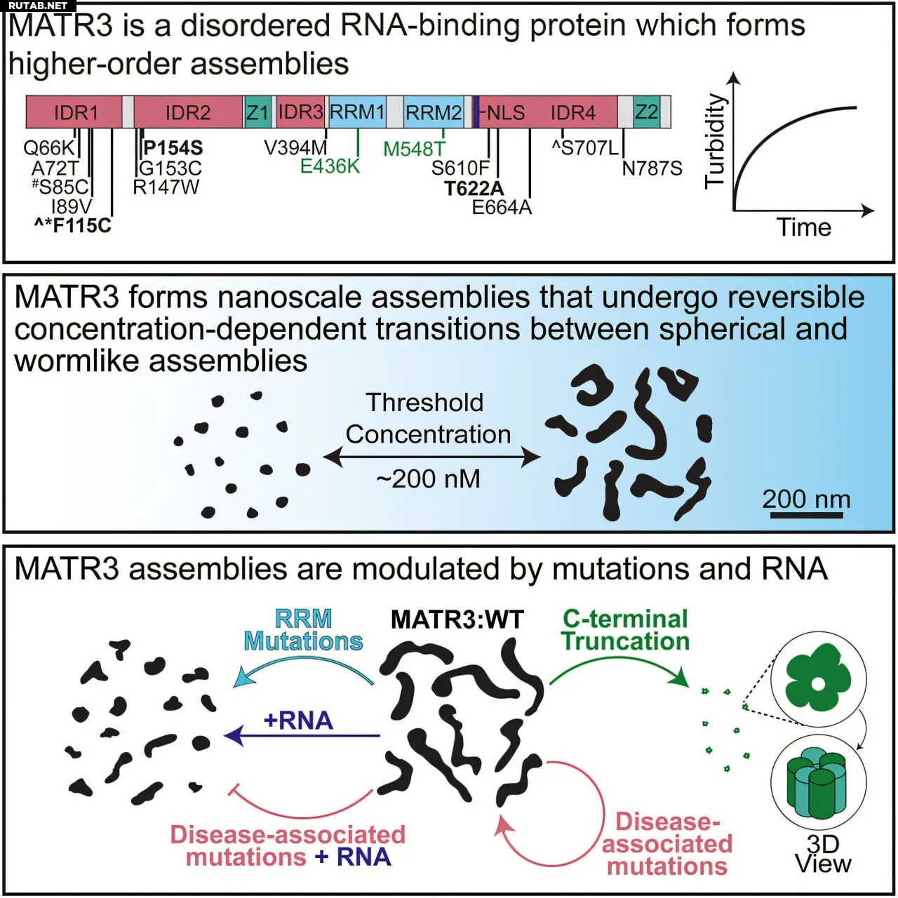 Когда нормальный Матрин-3 смешивали с РНК, червеобразные скопления значительно укорачивались. Однако мутантные версии белка, связанные с БАС, сохраняли свою длину при контакте с РНК, что может быть частью патологического процесса.