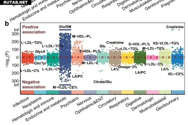 Оценив 313 показателей метаболитов плазмы, исследователи выявили более 50 000 значимых ассоциаций между метаболитами и заболеваниями. Анализ подчеркнул повсеместную роль нарушений липидного метаболизма в различных системах заболеваний. Особенно показатели, связанные с крупными частицами липопротеинов низкой плотности, показали наиболее сильные связи с различными заболеваниями.