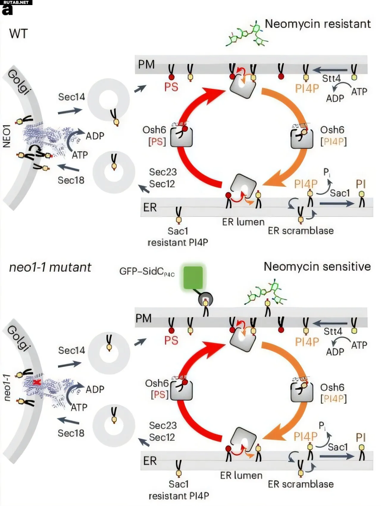 Когда в Neo1 возникал дефект, липид PI4P появлялся во внешнем слое клеточной мембраны, хотя в норме он находится внутри. Это позволяло неомицину связываться с липидом и проникать в клетку, вызывая негативные эффекты.