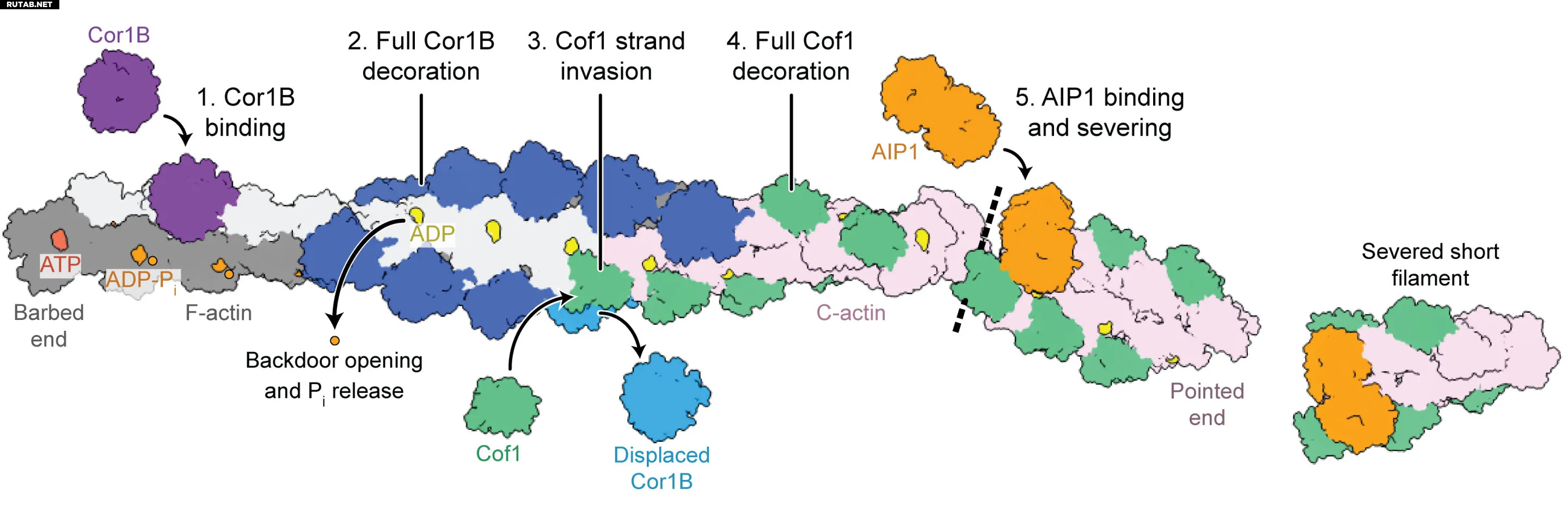 Процесс начинается с того, что коронин прикрепляется к филаменту и ускоряет высвобождение фосфата. Это вызывает небольшое изменение скрученности филамента, подготавливая его для связывания с множеством молекул кофилина. Связывание кофилина выталкивает коронин и создает платформу для AIP1, который затем действует как зажим: он захватывает и «сжимает» филамент, разрывая связи между актиновыми единицами, что в конечном итоге вызывает быстрое разрезание.
