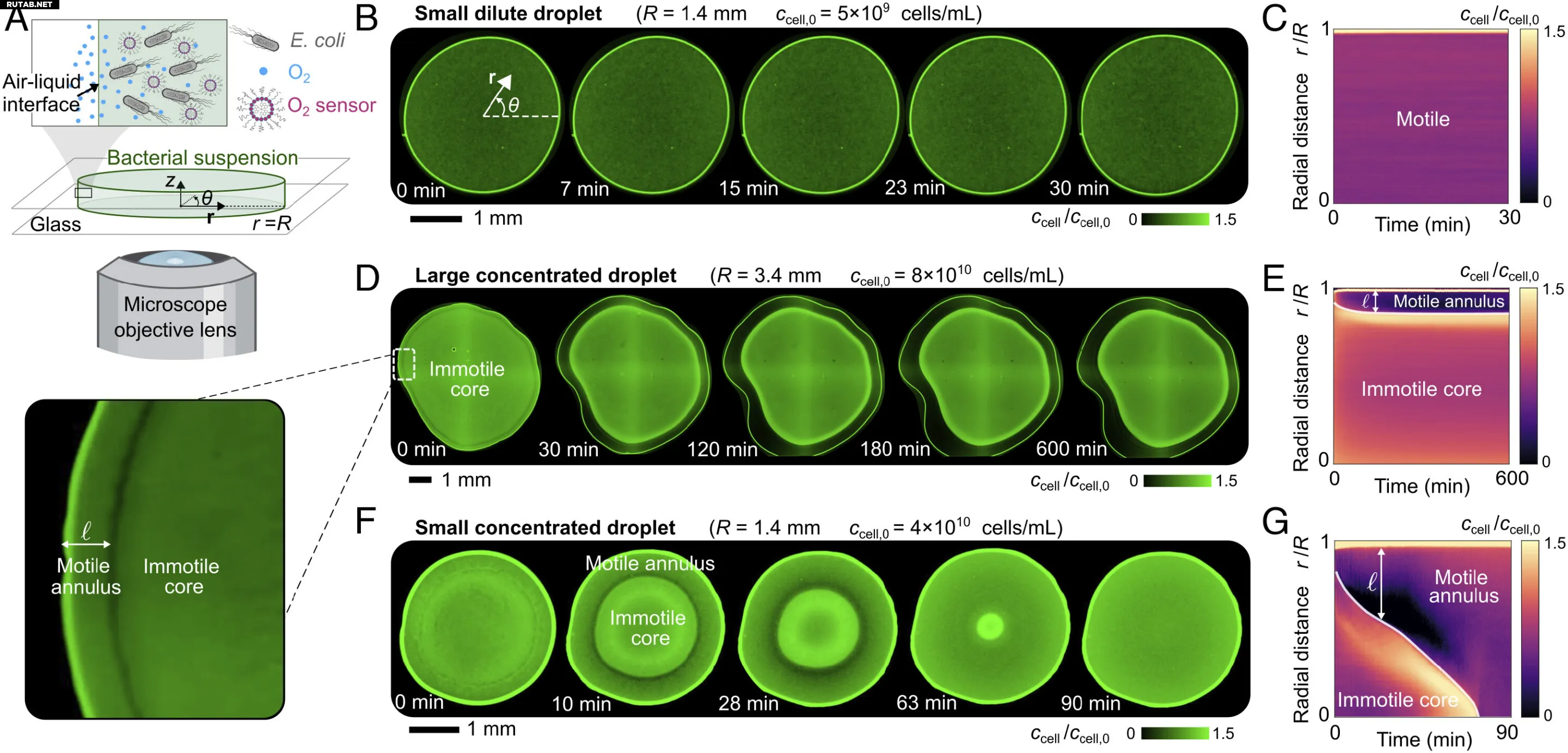 Ученые из Калифорнийского технологического института и Принстонского университета обнаружили, что бактерии, ограниченные каплей жидкости, способны самоорганизовываться в сложные, но предсказуемые паттерны в зависимости от уровня кислорода.