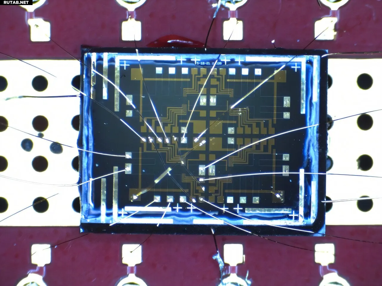 Изображение устройства, использованного в эксперименте. Чип GaAs установлен на печатной плате для размещения в разбавляющем холодильнике. Золотые провода обеспечивают электрические контакты. Автор: Герреро-Суарес и др.