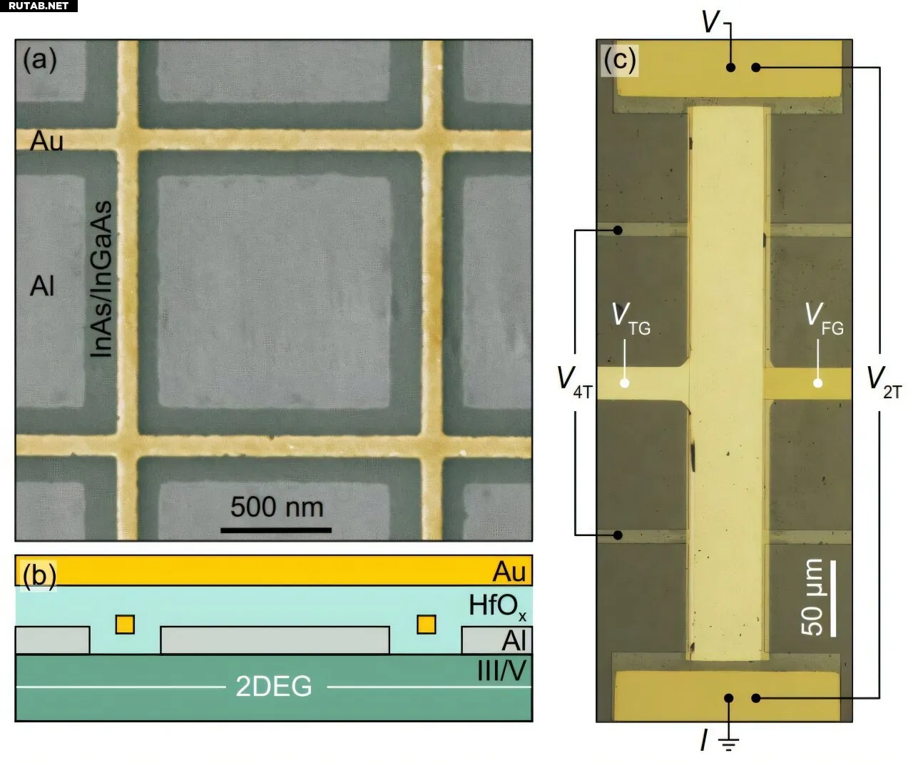 (a) Цветная растровая электронная микрофотография референсного устройства, сделанная до нанесения общего верхнего затвора. Квадратные алюминиевые островки (серые) сформированы на поверхности полупроводниковой гетероструктуры (зелено-серый) и разделены рамным затвором (желтый). (b) Схематическое поперечное сечение устройства, иллюстрирующее двухзатворную геометрию. Нижний рамный затвор настраивает центральную часть переходов, а общий верхний затвор настраивает двумерный электронный газ вокруг островков. (c) Оптическая микрофотография измеряемого устройства в виде холловского брусочка, показывающая схему измерений. Автор: Physical Review Letters (2025). DOI: 10.1103/xbm4-37cf