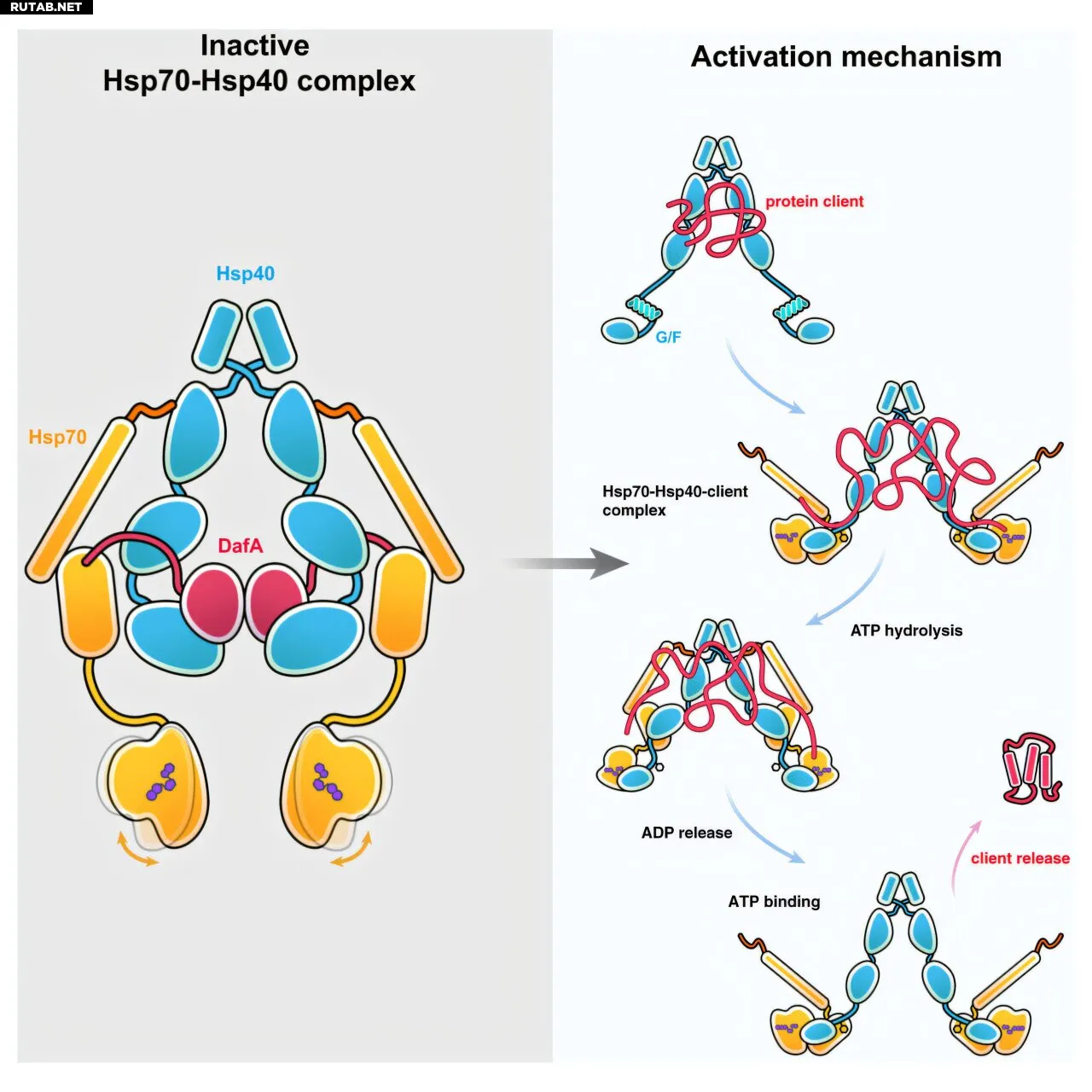 Ученые также обнаружили, что когда АТФ (энергетическая валюта клетки) связывается с Hsp70, белок меняет форму, выталкивая фенилаланин обратно в связывающий карман, что в свою очередь выталкивает белок-клиент и высвобождает его в клетку.