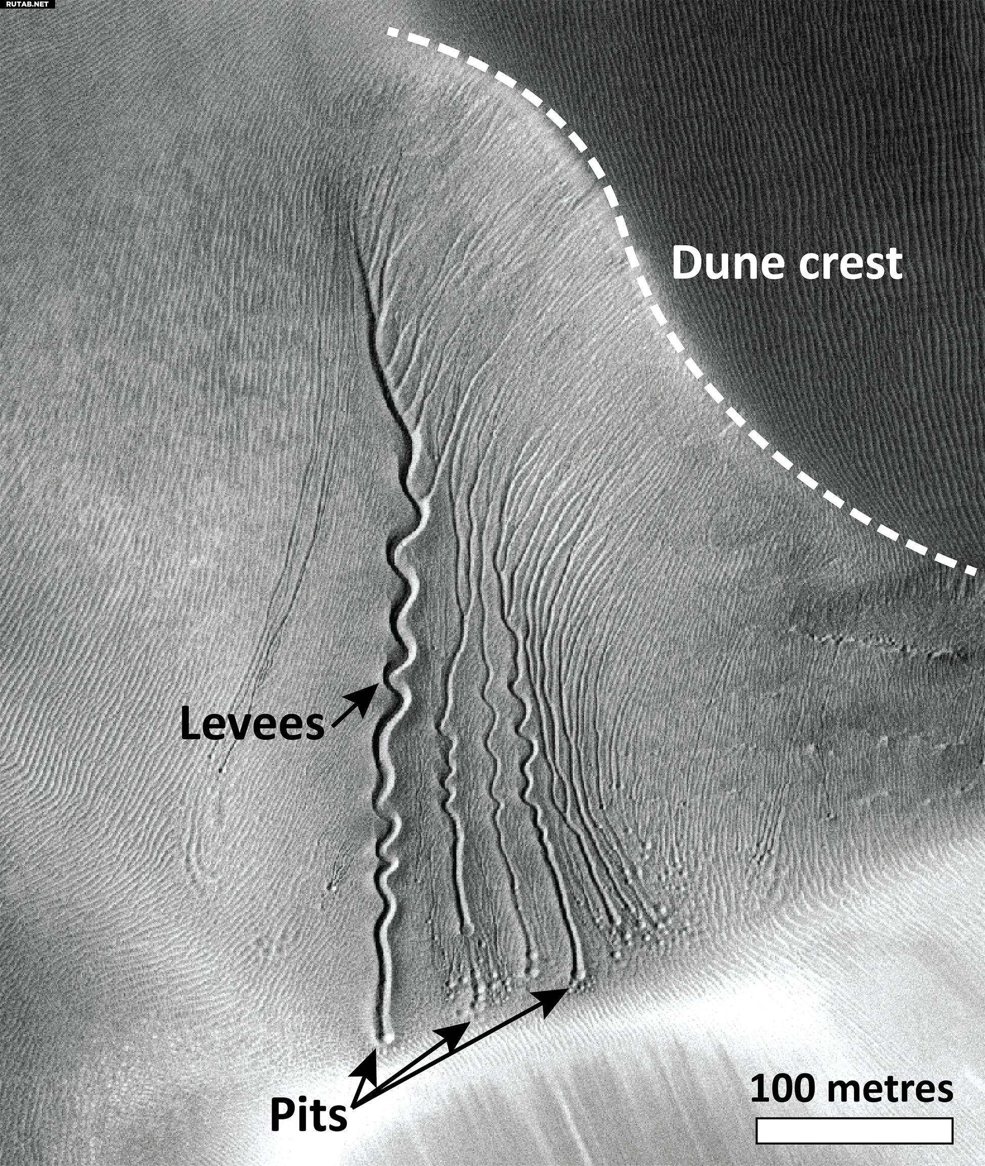 Ученые из Утрехтского университета раскрыли тайну происхождения загадочных извилистых оврагов на марсианских дюнах. Исследователь Лоннеке Рулфс экспериментально доказала, что их создают движущиеся блоки сухого льда (CO₂).